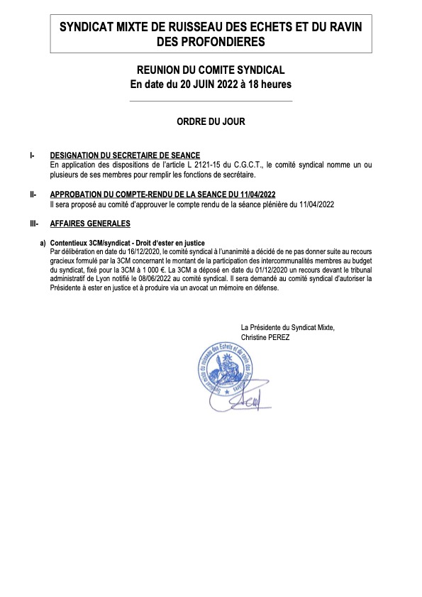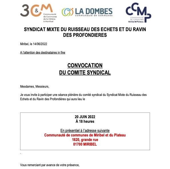 Convocation du Comité Syndical (Syndicat mixte du ruisseau des Echets et du Ravin des Profondières)