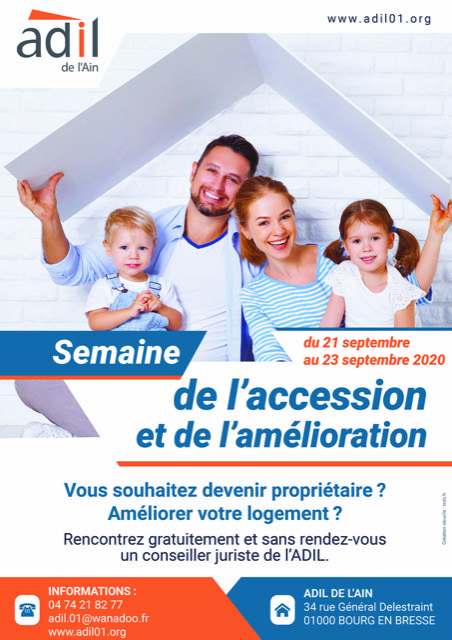 L’Agence Départementale d’Information sur le Logement de l’Ain organise, du lundi 21 septembre 2020 au mercredi 23 septembre 2020 inclus, trois jours d’information sur l’accession à la propriété et l’amélioration de l’habitat.