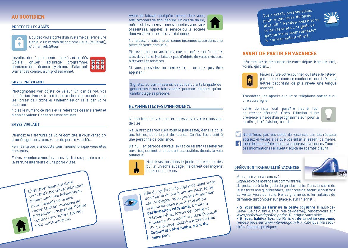 Pendant toute absence prolongée de votre domicile, vous pouvez vous inscrire à l’opération tranquillité vacances. Les services de police ou de gendarmerie se chargent alors de surveiller votre logement.