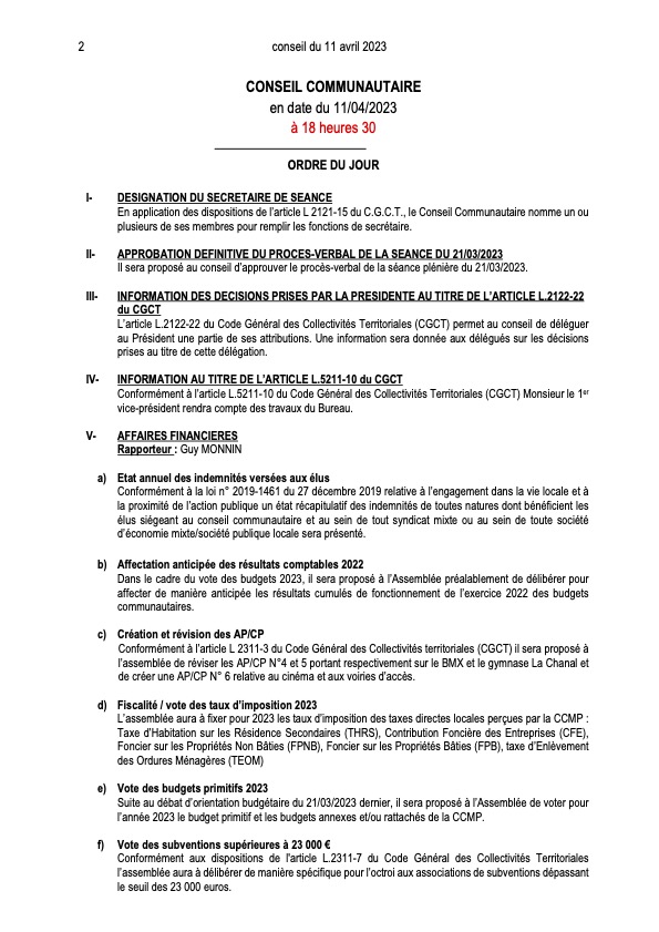 Ordre du jour du Conseil Communautaire :