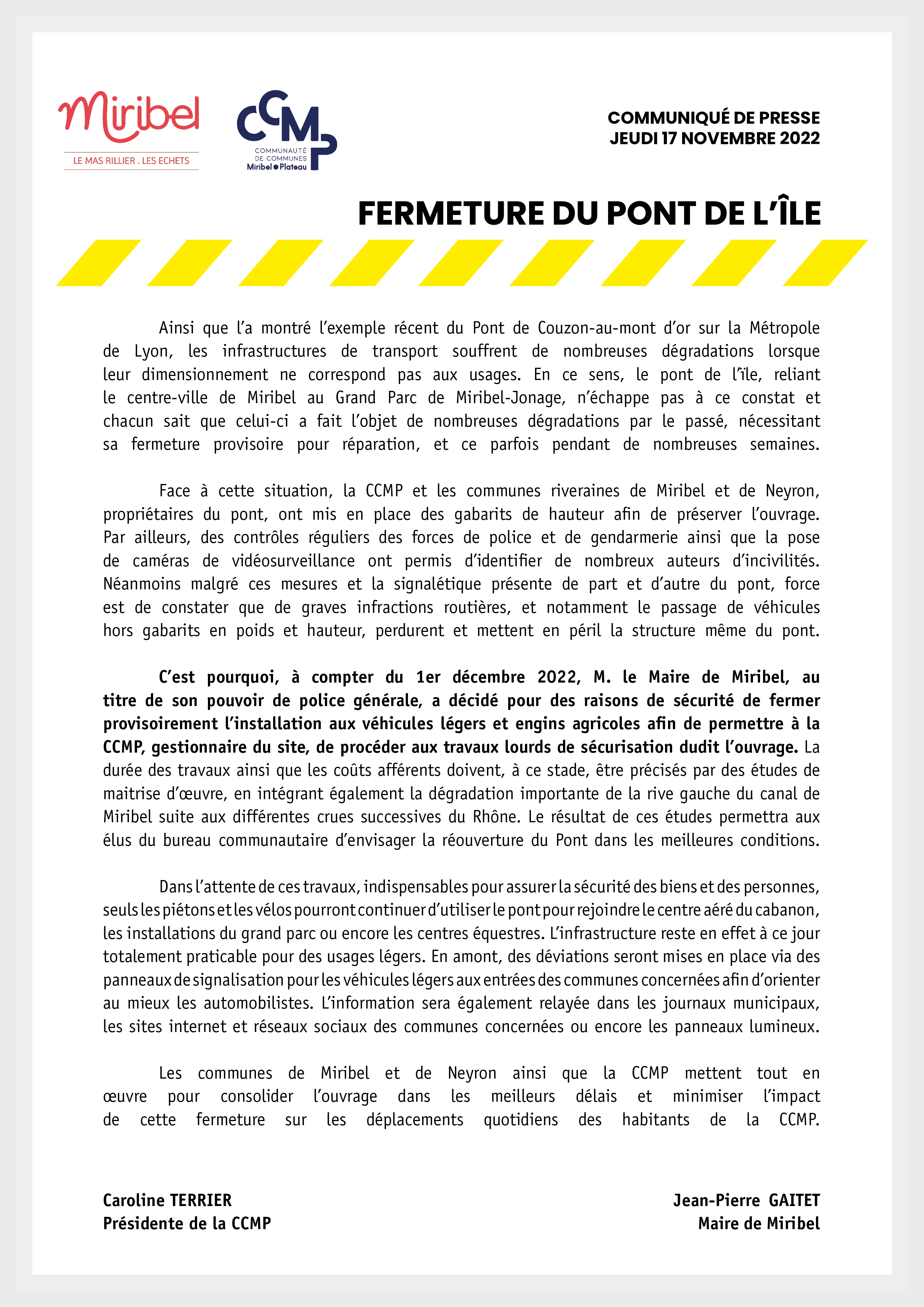 A compter du 1er décembre 2022, M. le Maire de Miribel, au titre de son pouvoir de police générale, a décidé pour des raisons de sécurité de fermer provisoirement le pont de l’île aux véhicules légers et engins agricoles afin de permettre à la CCMP, gestionnaire du site, de procéder aux travaux lourds de sécurisation dudit l’ouvrage.