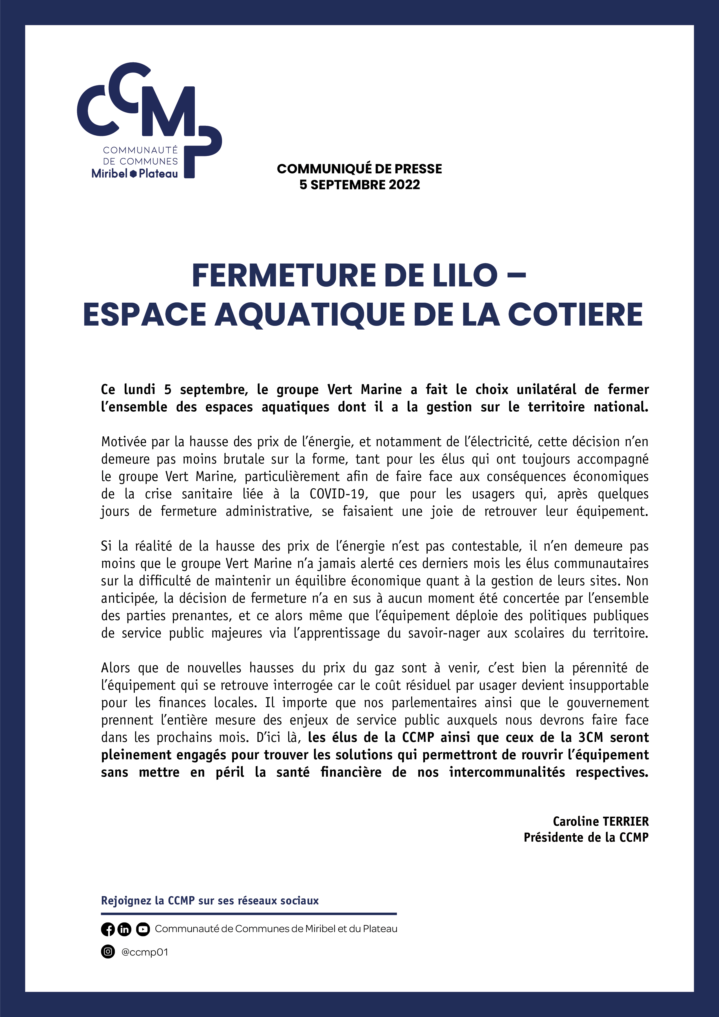 Communiqué de presse fermeture temporaire de Lilo Espace Aquatique
