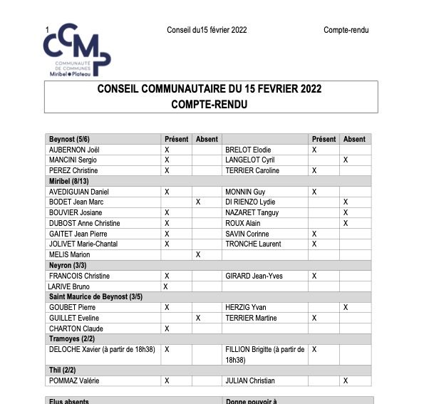 Compte-rendu conseil communautaire du 15 février 2022 en présence des élus du territoire de la Communauté de Communes de Miribel et du Plateau.