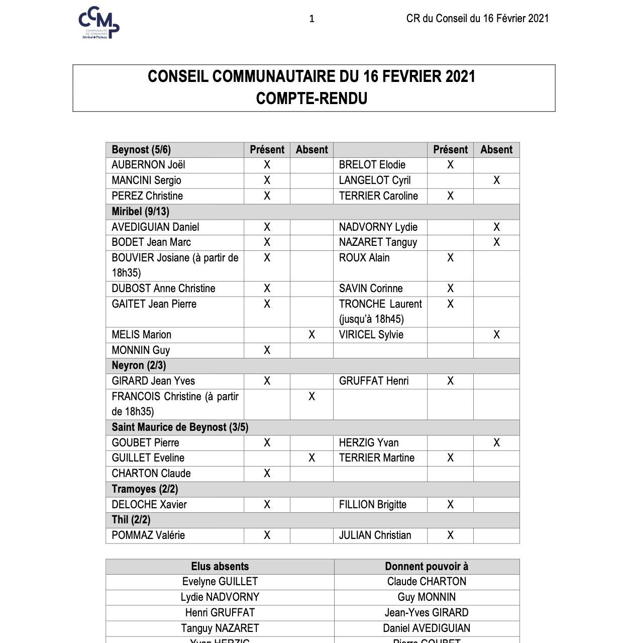 Compte-rendu conseil communautaire du 16 février 2021 en présence des élus du territoire de la Communauté de Communes de Miribel et du Plateau.