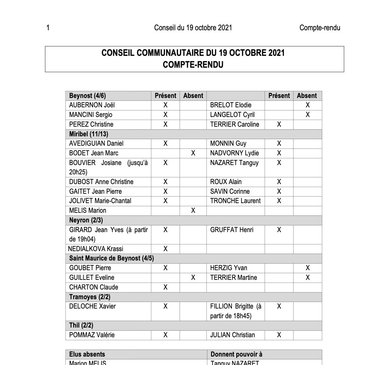 Compte-rendu conseil communautaire du 19 octobre 2021 en présence des élus du territoire de la Communauté de Communes de Miribel et du Plateau.