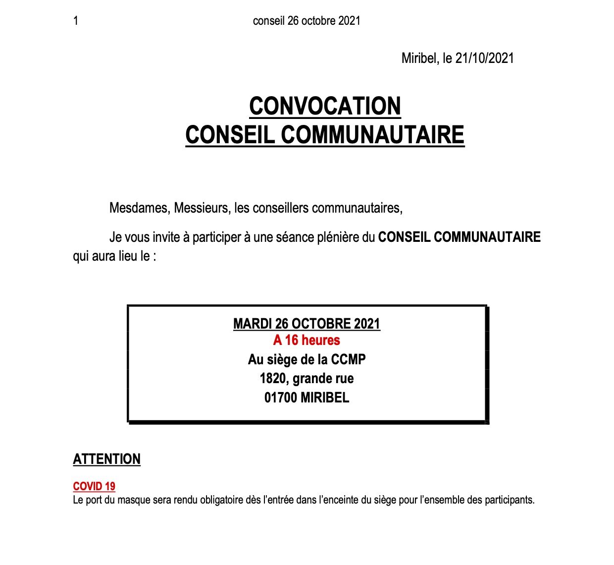 Convocation Conseil Communautaire le 26 octobre 2021