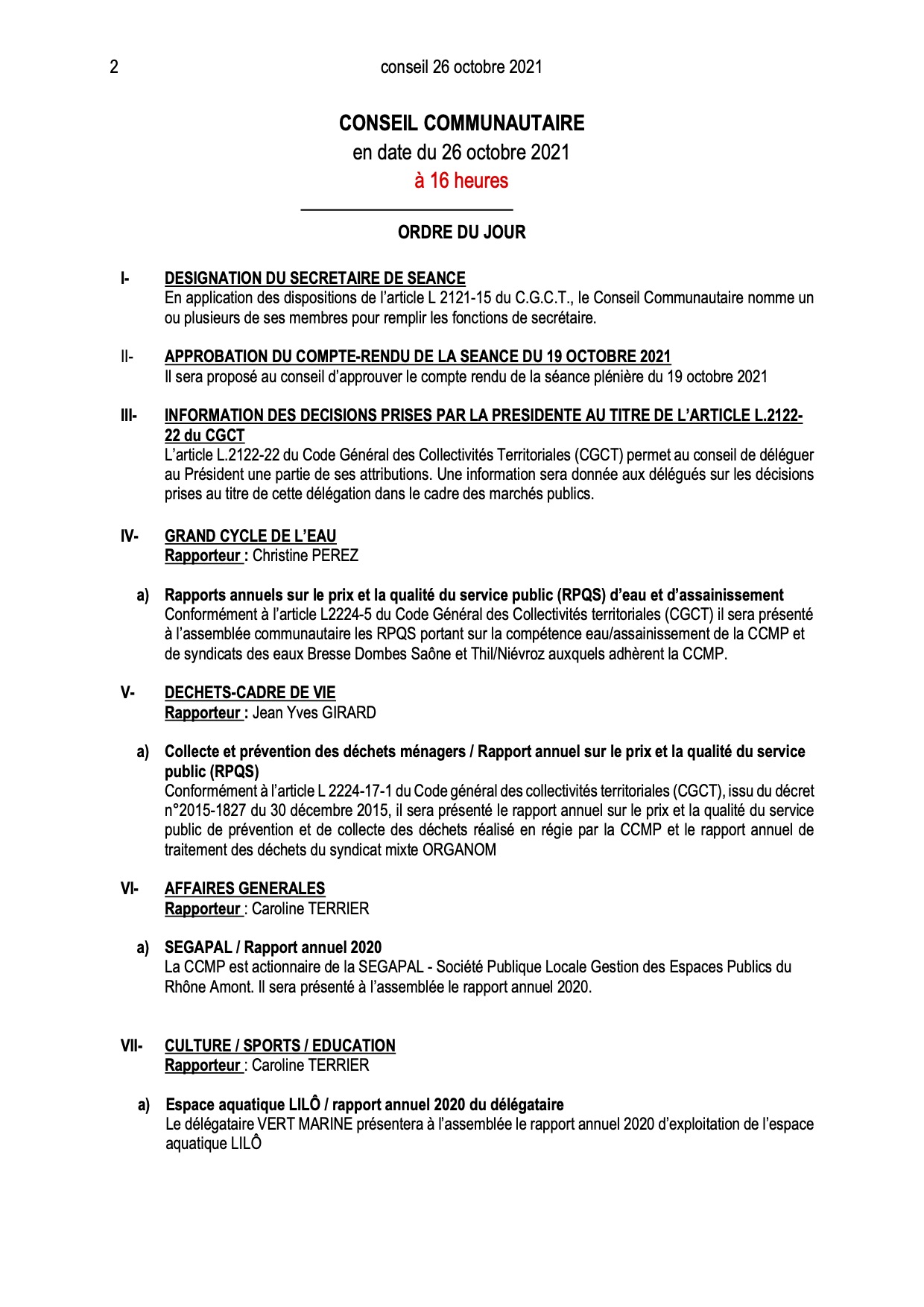 Ordre du jour du Conseil Communautaire :