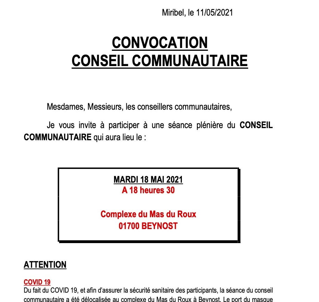 Convocation Conseil Communautaire le mardi 18 mai 2021