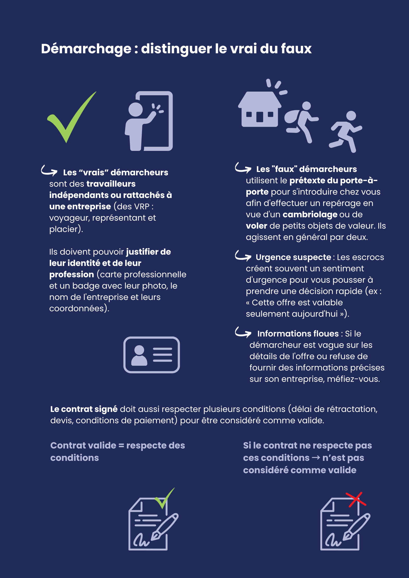 Chaque jour, de nombreux démarcheurs – officiels ou non – peuvent frapper à votre porte. Il est parfois difficile de distinguer une entreprise sérieuse d’un démarchage frauduleux.