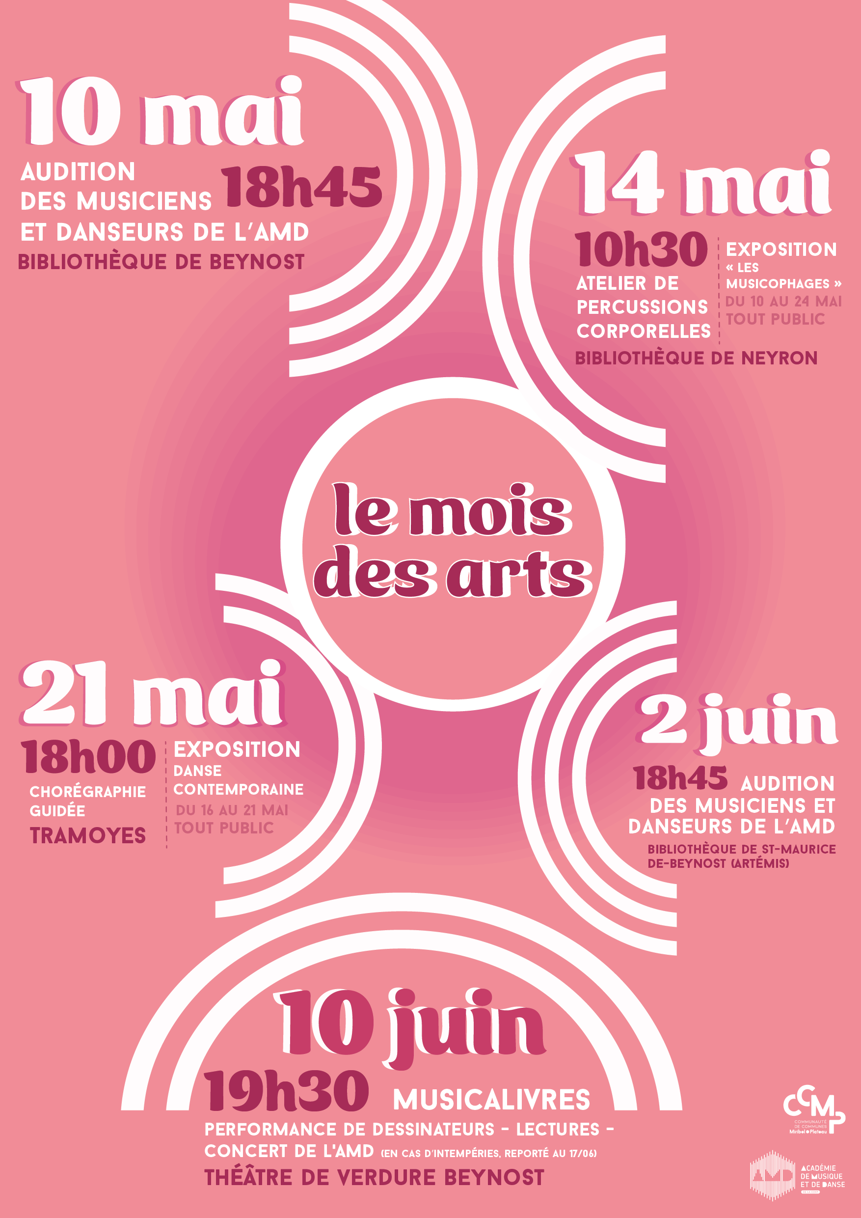 - 2 juin à 18h45 : auditions des musiciens et danseurs de l’AMD au sein de la bibliothèque de Saint-Maurice-de-Beynost (Artémis) !
