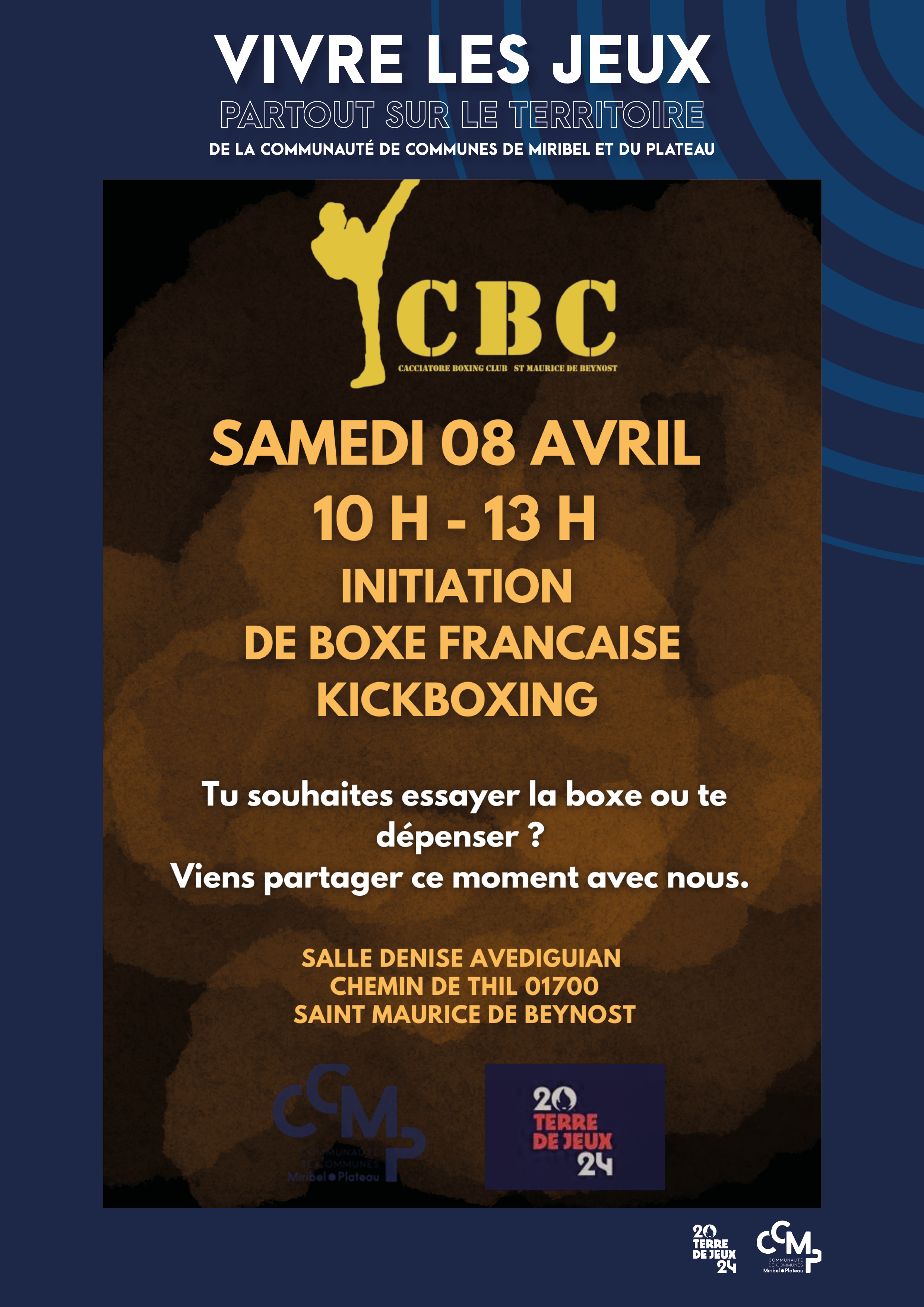 Samedi 8 avril de 10h à 13h avec Cacciatore Boxing Club, initiation de boxe française et kickboxing.