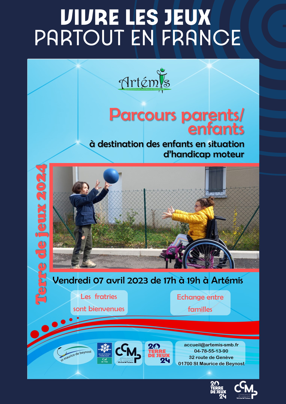 Vendredi 7 avril de 17h à 19h au Centre socio-culturel ARTEMIS parcours parents / enfants à destination des enfants en situation de handicap moteur proposé par Cécilia, coach et maman de Zoé atteinte d’une maladie génétique.