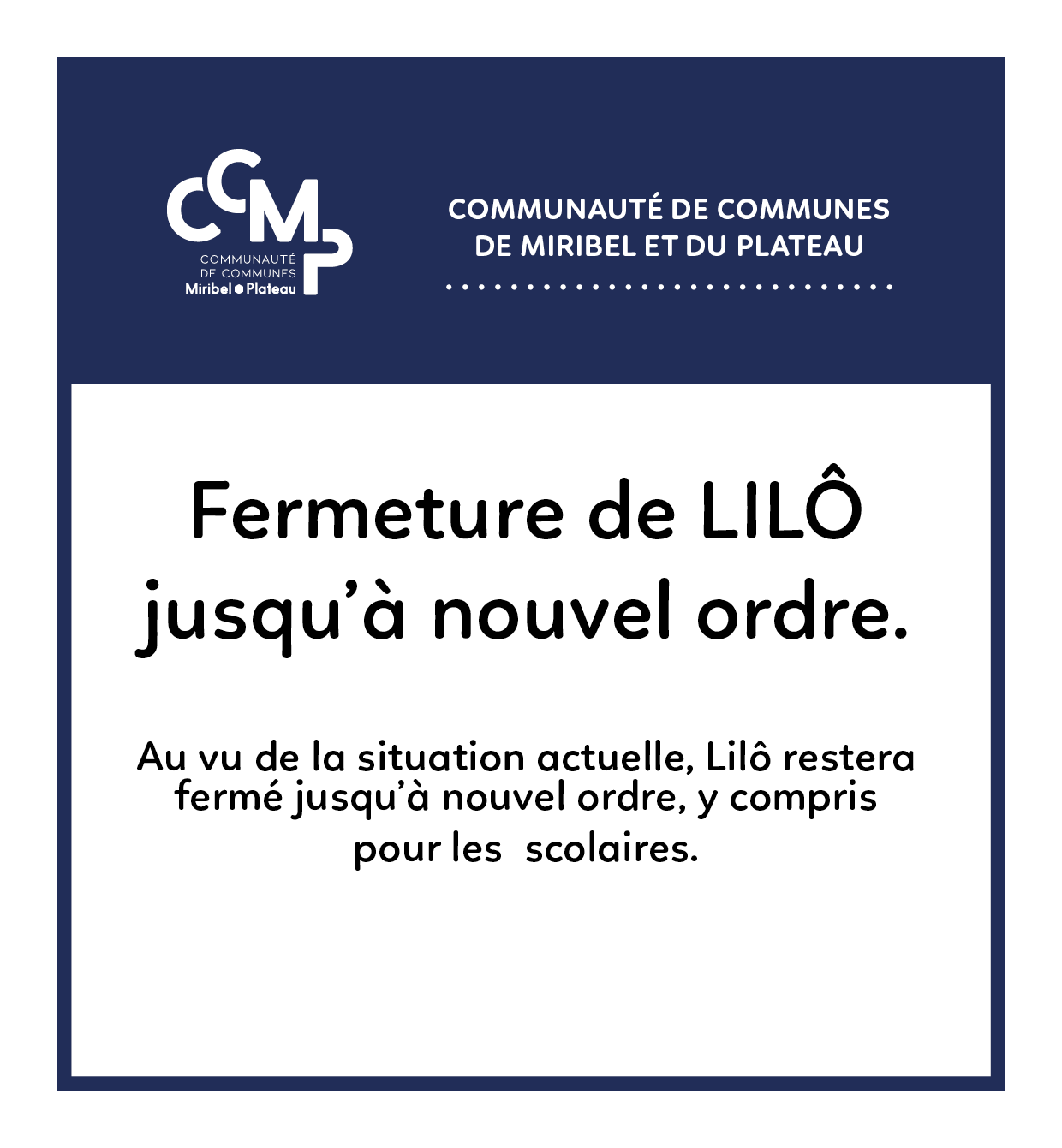 Au vu de la situation actuelle, la Communauté de Communes de Miribel et du Plateau a pris la décision de fermer Lilô jusqu’à nouvel ordre.