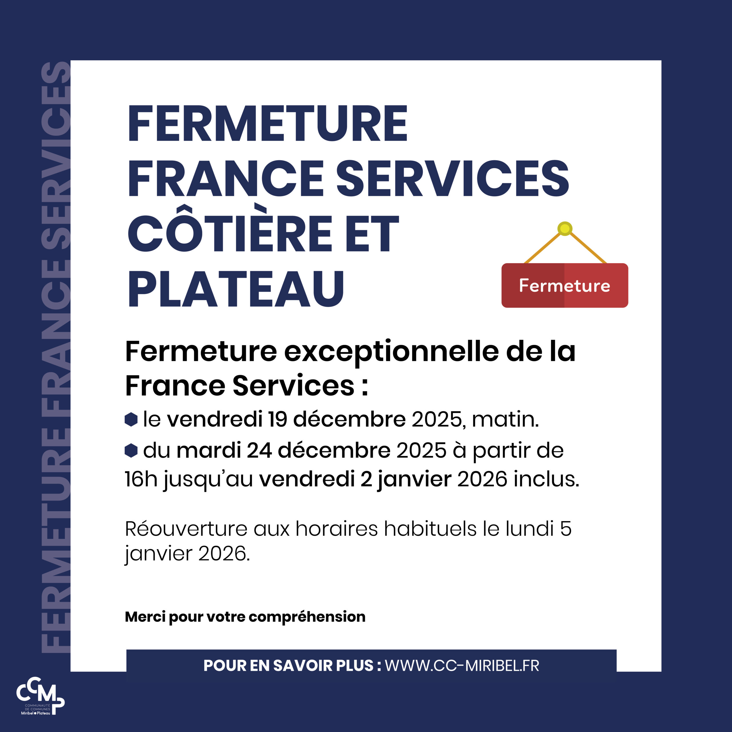 Fermetures exceptionnelles de France Services Côtière et Plateau aux dates suivantes :
