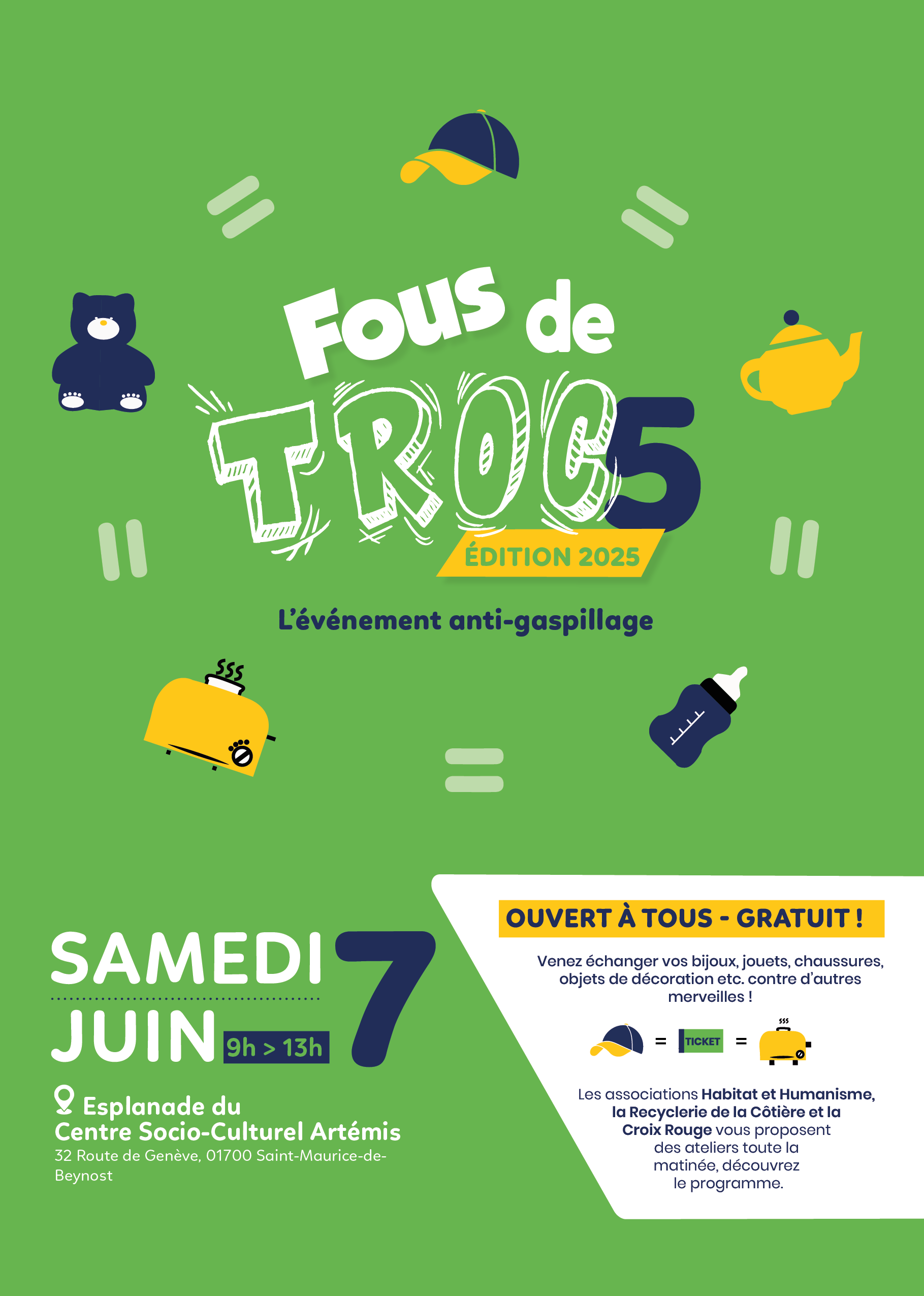 Rendez-vous le samedi 7 juin 2025 de 9h à 13h sur l’esplanade d’Artémis à Saint-Maurice-de-Beynost pour une matinée placée sous le signe du troc, du partage et des gestes durables du quotidien.