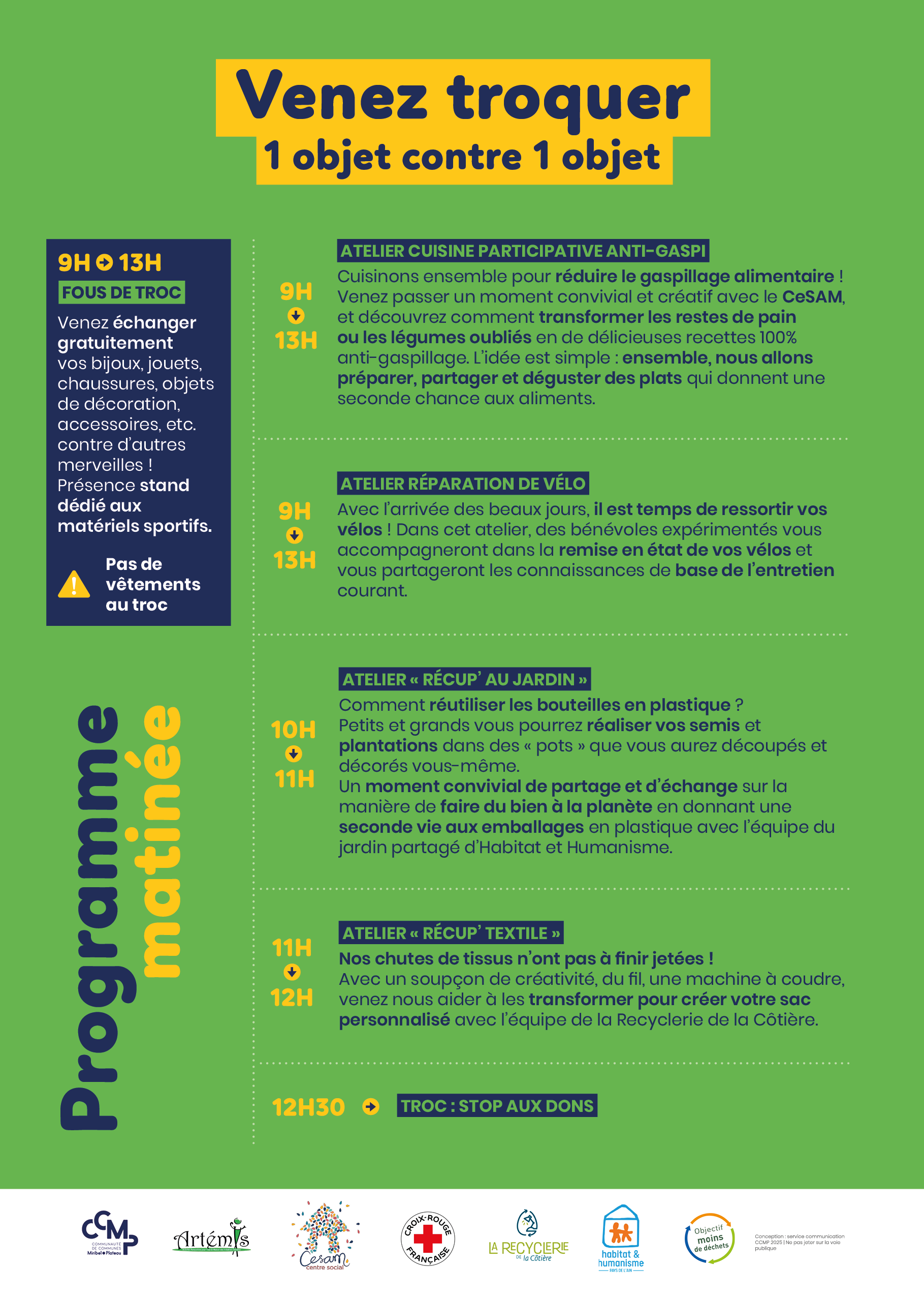 Artémis, le CeSAM, la Croix-Rouge, Habitat et Humanisme et la Recyclerie de la Côtière seront mobilisés aux côtés de la CCMP pour faire de cette matinée une réussite citoyenne. L’objectif : valoriser les initiatives locales et sensibiliser chacun aux gestes simples pour consommer autrement.