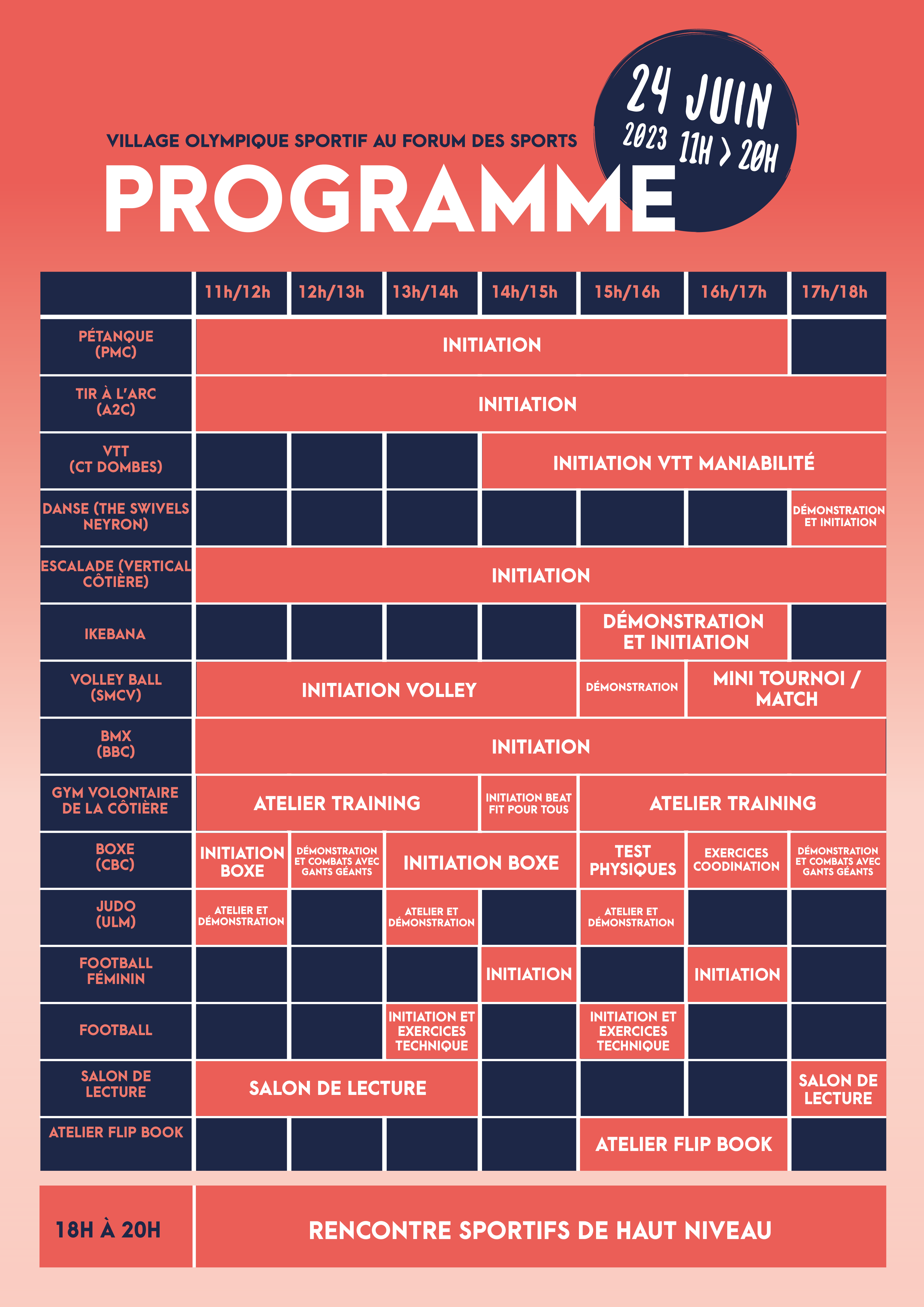 De 11h à 18h, initiations sportives, découvertes et démonstrations à destination du grand public. Les visiteurs pourront s’initier à plusieurs sports tels que l’escalade avec un mur d’escalade mobile, la boxe avec un ring gonflable et des mini jeux, le football avec la mise en avant du football féminin, le BMX avec des rampes, le judo avec un tatami, VTT, Volley, Pétanque …
