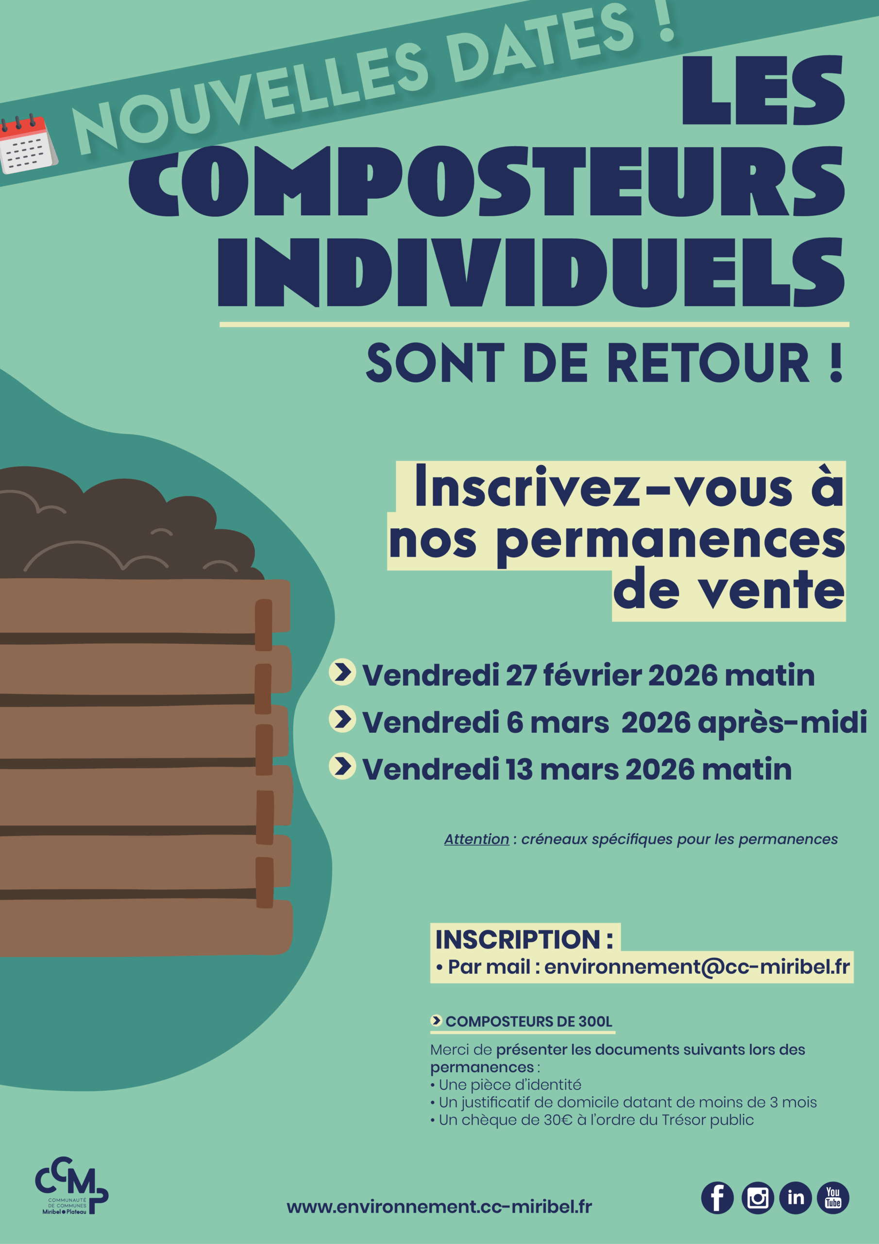La CCMP met à disposition des composteurs de 300L au tarif de 30€. Pour en obtenir un, vous devez vous inscrire à l’une de nos permanences par mail : environnement@cc-miribel.fr