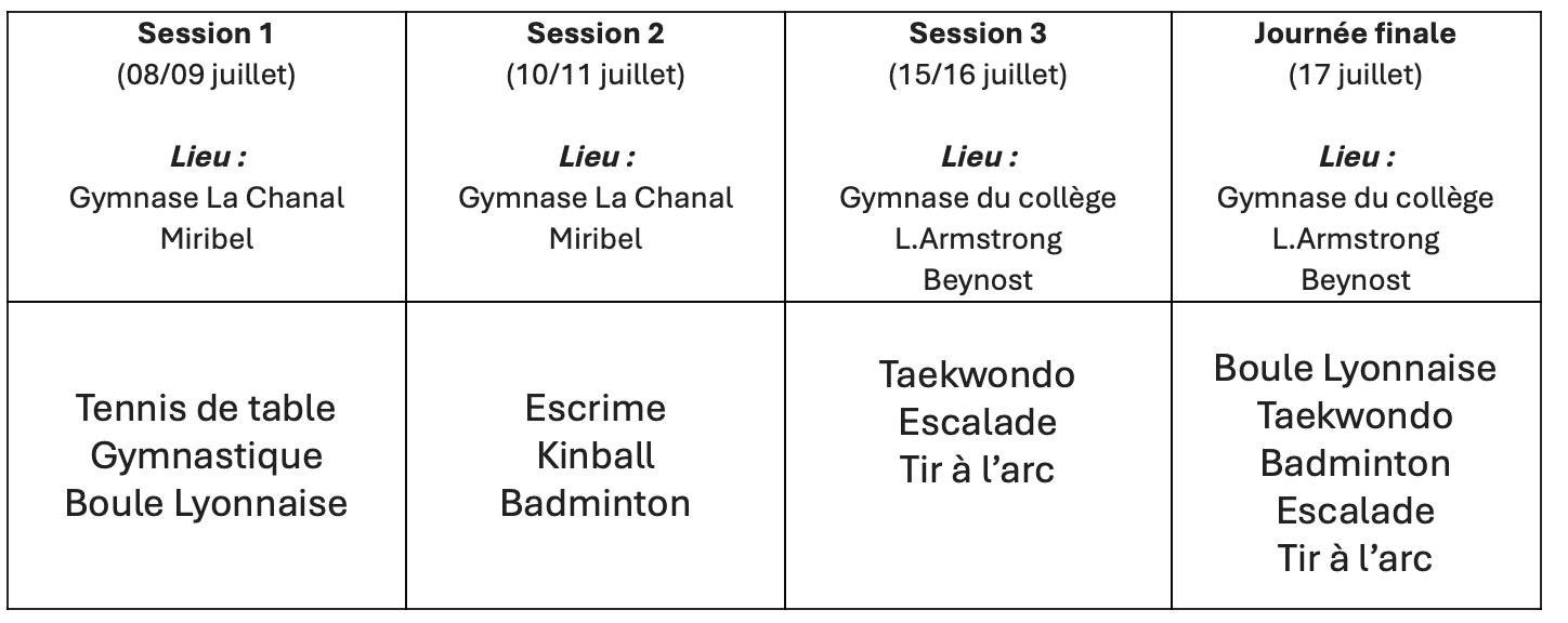 Elles sont segmentées en 3 Sessions et journée finale. 3 centres par jour participent ensemble à 3 activités (une session dure 2 jours). La découverte des activités se fait le matin et un challenge est proposé aux enfants l’après-midi.