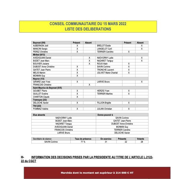 Compte-rendu conseil communautaire du 15 mars 2022 en présence des élus du territoire de la Communauté de Communes de Miribel et du Plateau.