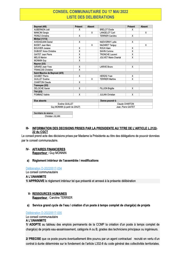 Liste des délibérations du conseil communautaire du 17 mai 2022 en présence des élus du territoire de la Communauté de Communes de Miribel et du Plateau.