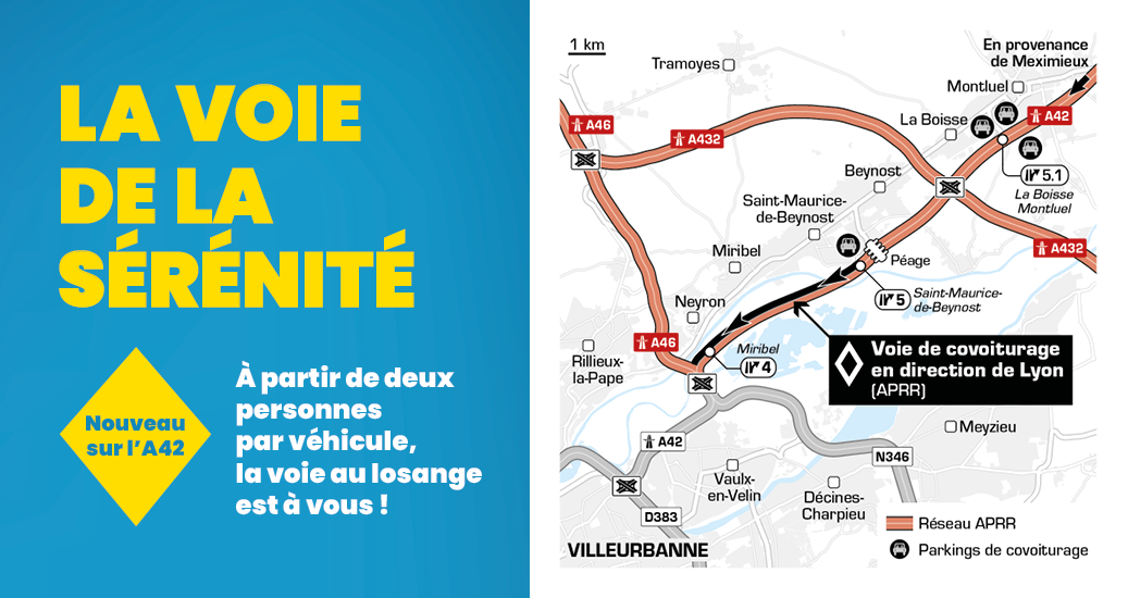 Pour répondre aux défis de la mobilité urbaine et de la transition écologique, APRR a mis en place une voie réservée aux véhicules à 2 occupants ou plus (appelée VR2+) sur l’autoroute A42 entre la barrière de péage de Saint-Maurice-de-Beynost et le Nœud des Îles.