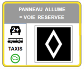 Un losange lumineux marque cette voie spécifique. Des panneaux d’information dynamique préviennent les automobilistes en amont pour faciliter l’adaptation.