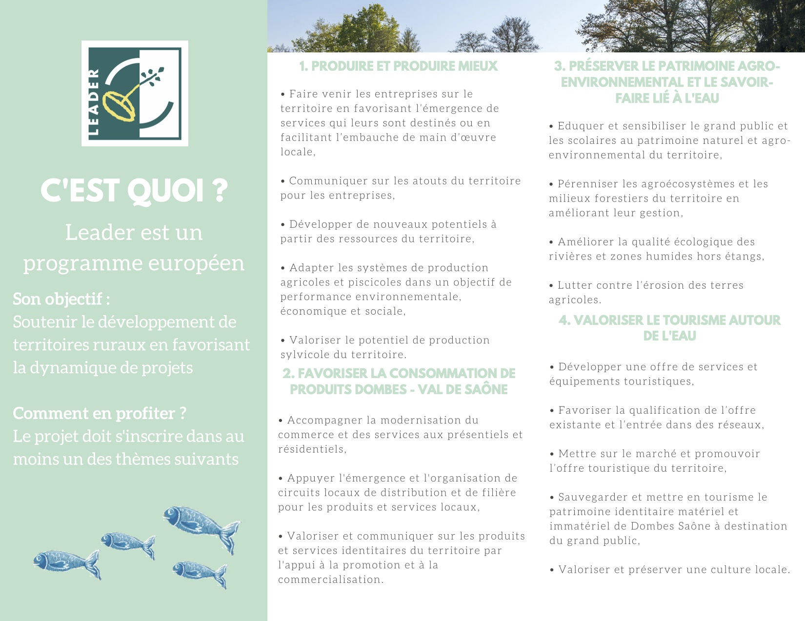 LEADER est un programme européen qui vise à soutenir des projets pilotes en zone rurale. LEADER est un axe du FEADER (Fonds Européen Agricole et de Développement de l’Espace Rural). Il donne aux territoires un cadre propice à l’émergence de projets collectifs et de qualité.