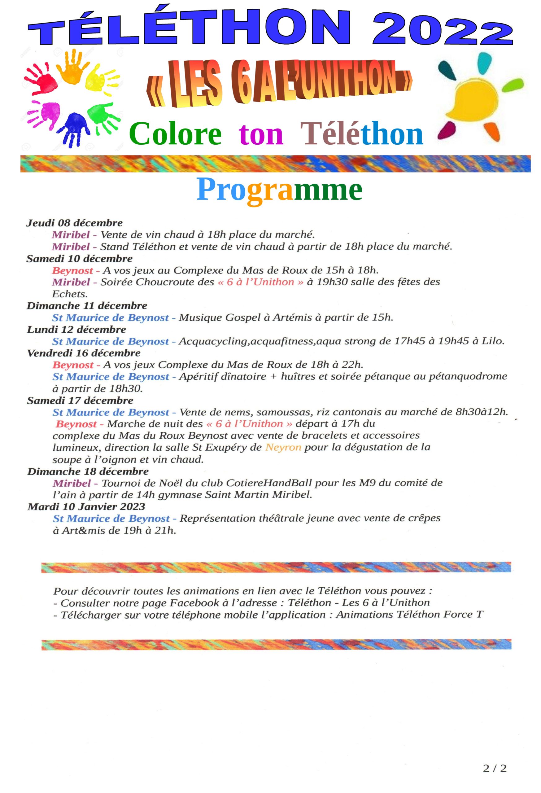 A l'occasion du téléthon, les 6 communes du territoire de la Communauté de Communes de Miribel et du Plateau (Beynost, Neyron, Miribel, Saint-Maurice-de-Beynost, Tramoyes et Thil) ont décidé de se réunir pour élaborer un programme sur l'ensemble du territoire du 22 octobre au 18 décembre.