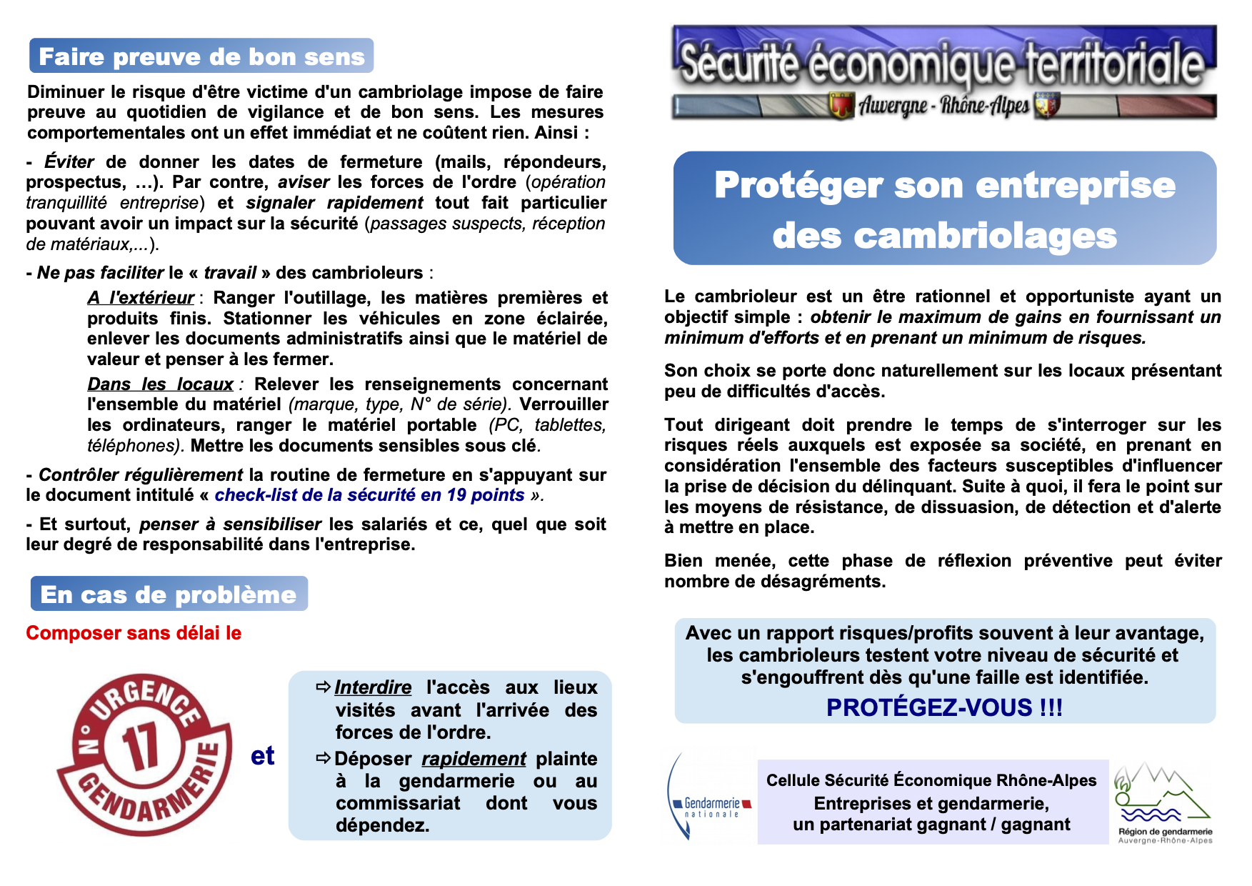 Pour cela, n’hésitez pas à leur faire part de toute difficulté et, au besoin, à renseigner le formulaire joint dans les publications pour la sécurité et la tranquillité de vos locaux professionnels à l’adresse suivante : bta.miribel@gendarmerie.interieur.gouv.fr