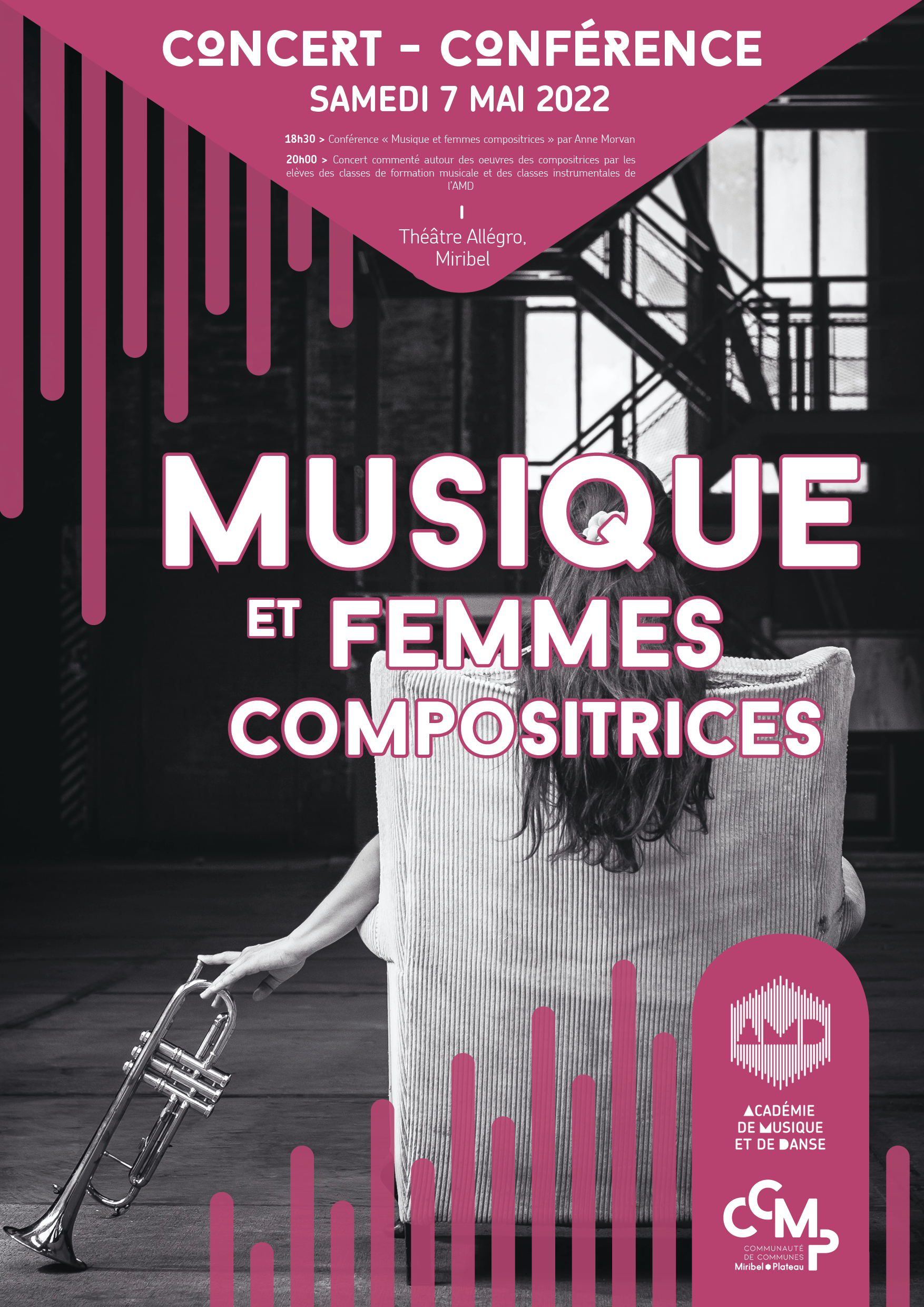- 18h30 : Conférence « Musique et femmes compositrices » par Anne Morvan, pianiste-accompagnatrice et référente égalité Femmes et Hommes au Conservatoire Régional de Musique de Lyon.