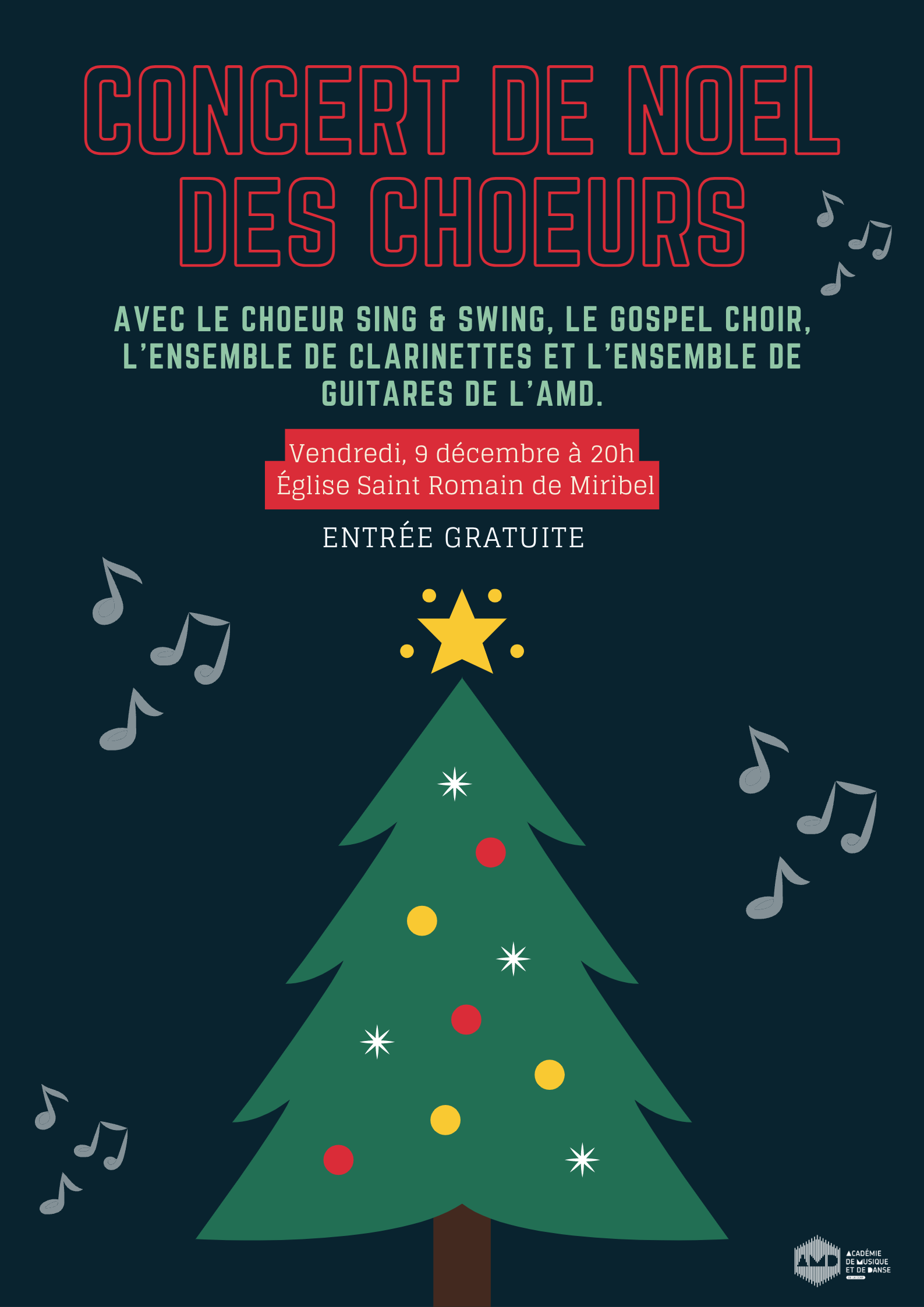 Vendredi 9 décembre à 20h venez assister au concert de Noël avec le choeur Sing & Swing, le Gospel Choir, l’ensemble de clarinettes et l’ensemble de guitares de l’AMD.
