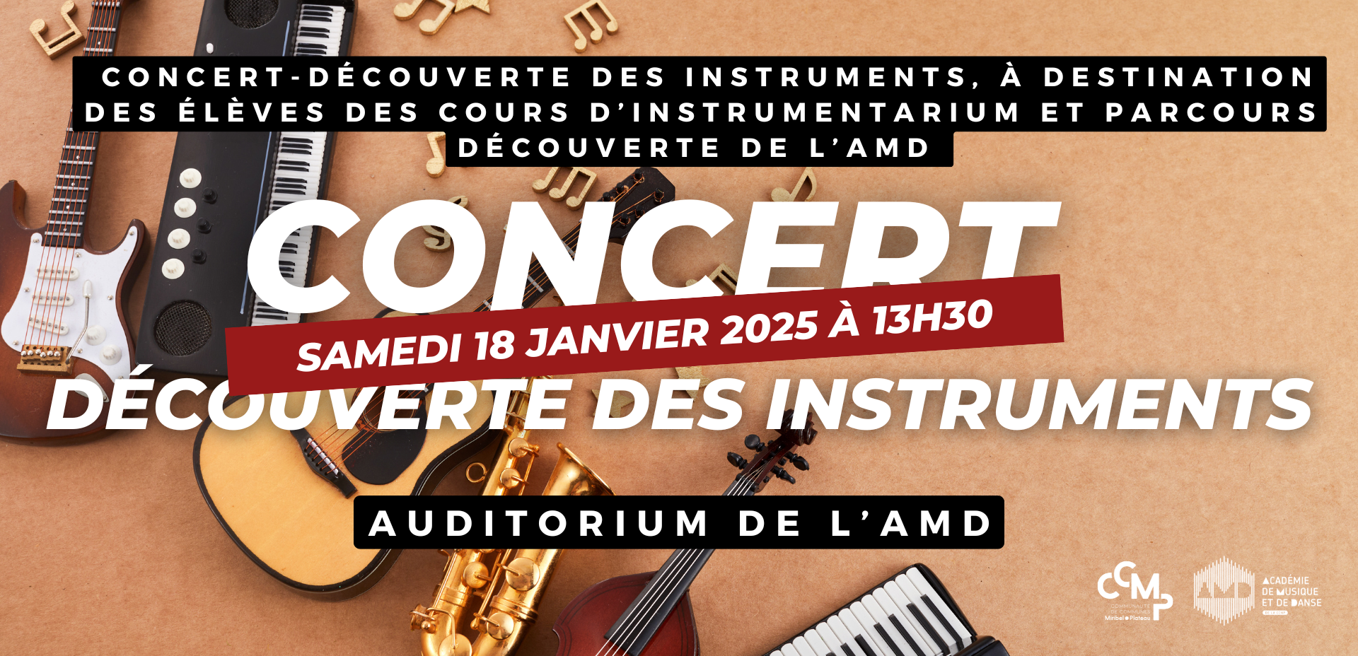Samedi 18 janvier 2025 à 13h30 venez découvrir un concert-découverte des instruments à destination des élèves des cours d’instrumentarium et parcours découverte de l’AMD.