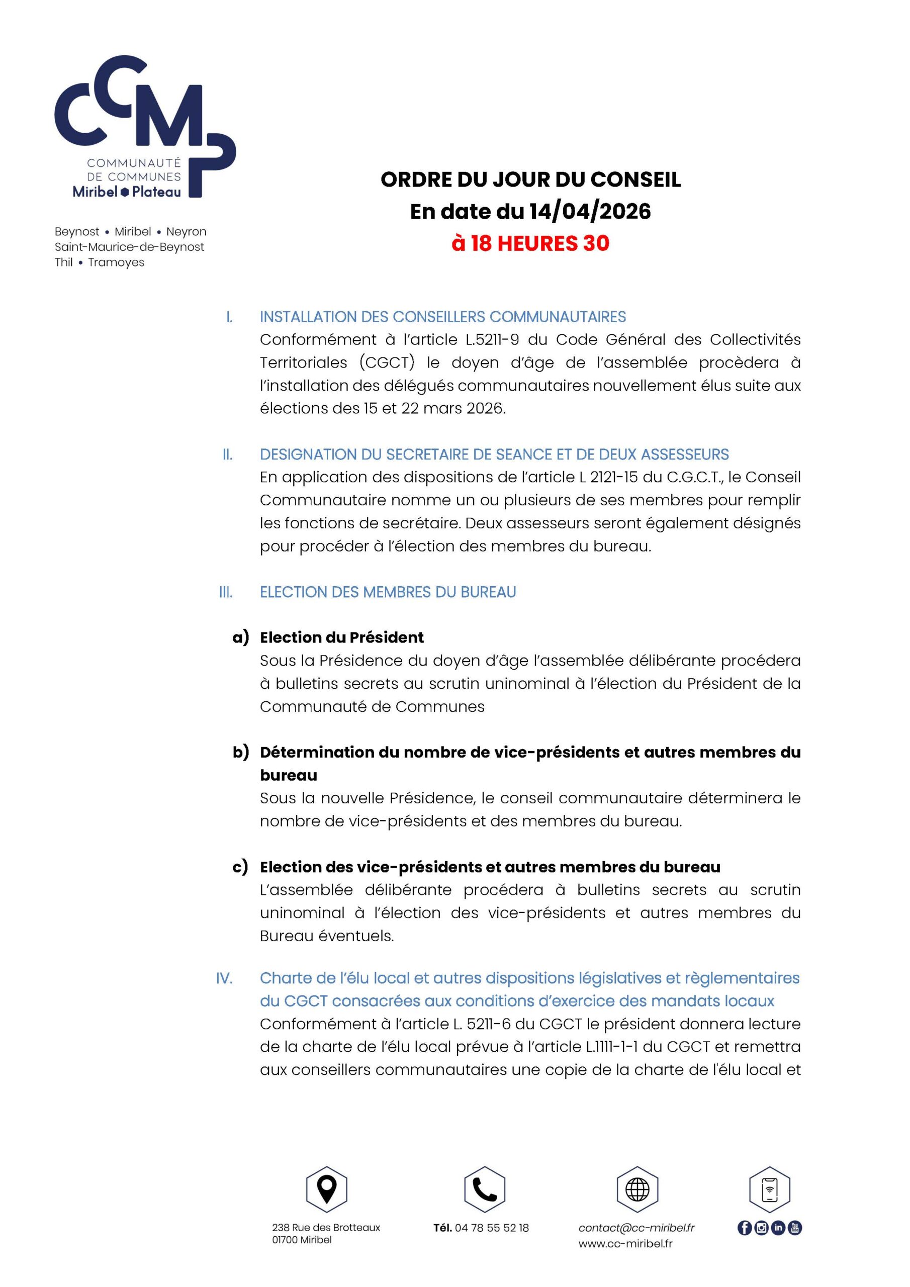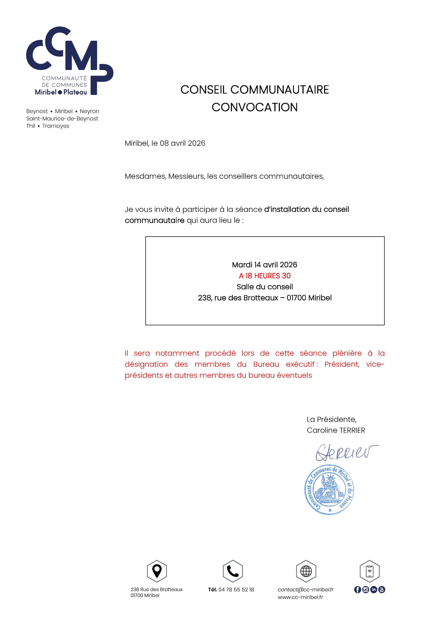Le Conseil Communautaire de la CCMP se tiendra le mardi 14 avril 2026 à 18h30, au siège de la CCMP (238 Rue des Brotteaux, 01700 Miribel).