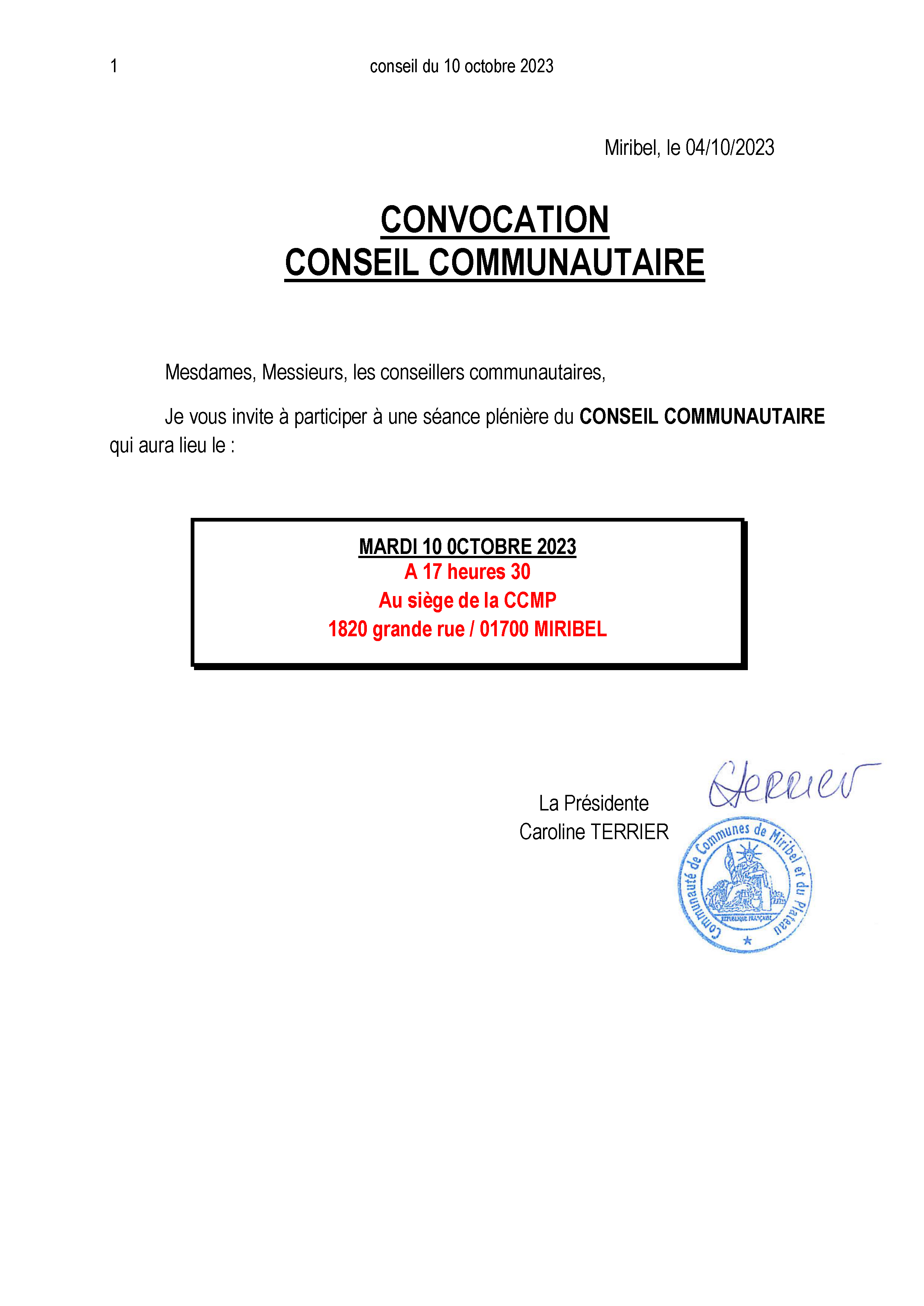 Convocation Conseil Communautaire