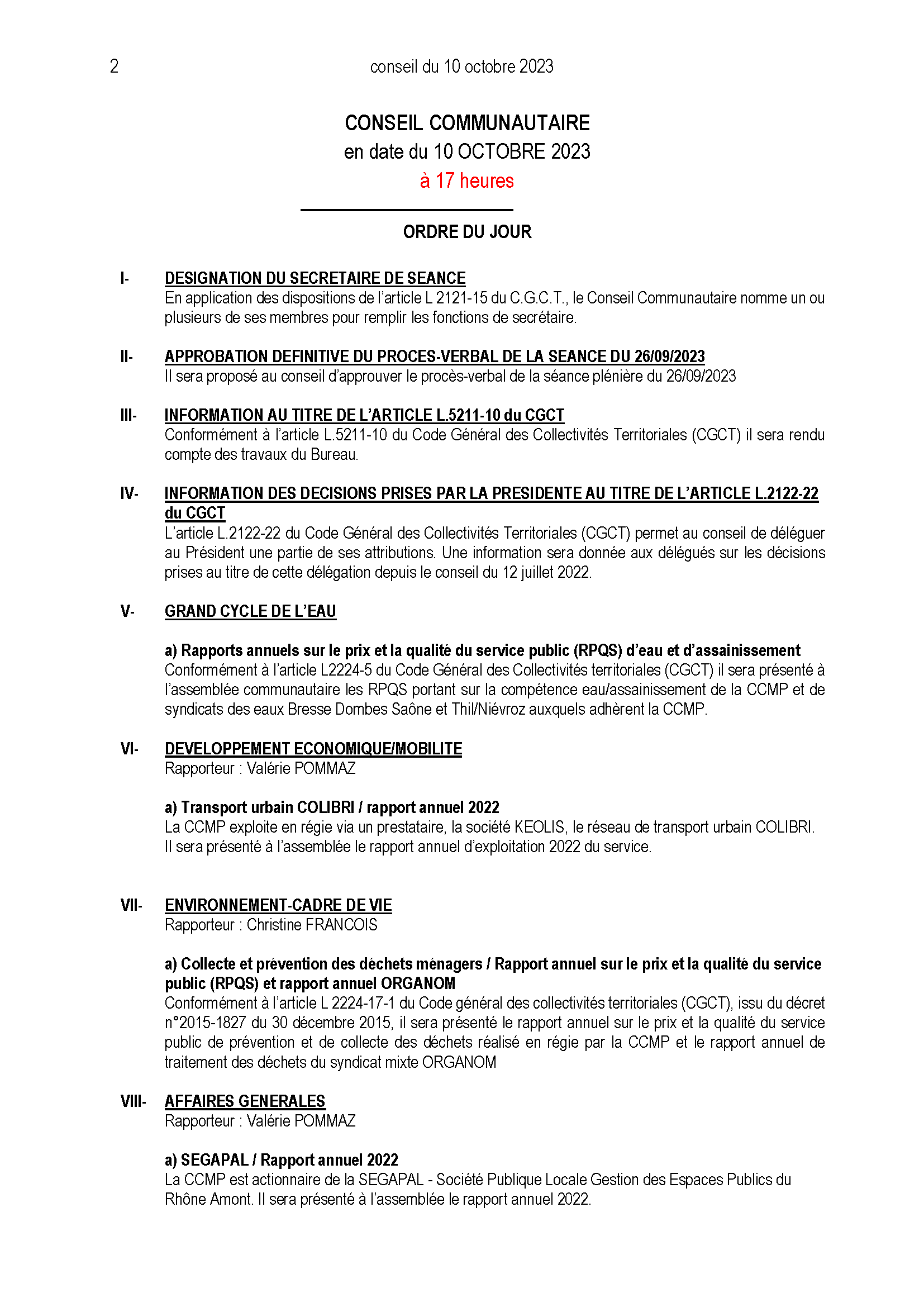 Ordre du jour du Conseil Communautaire :