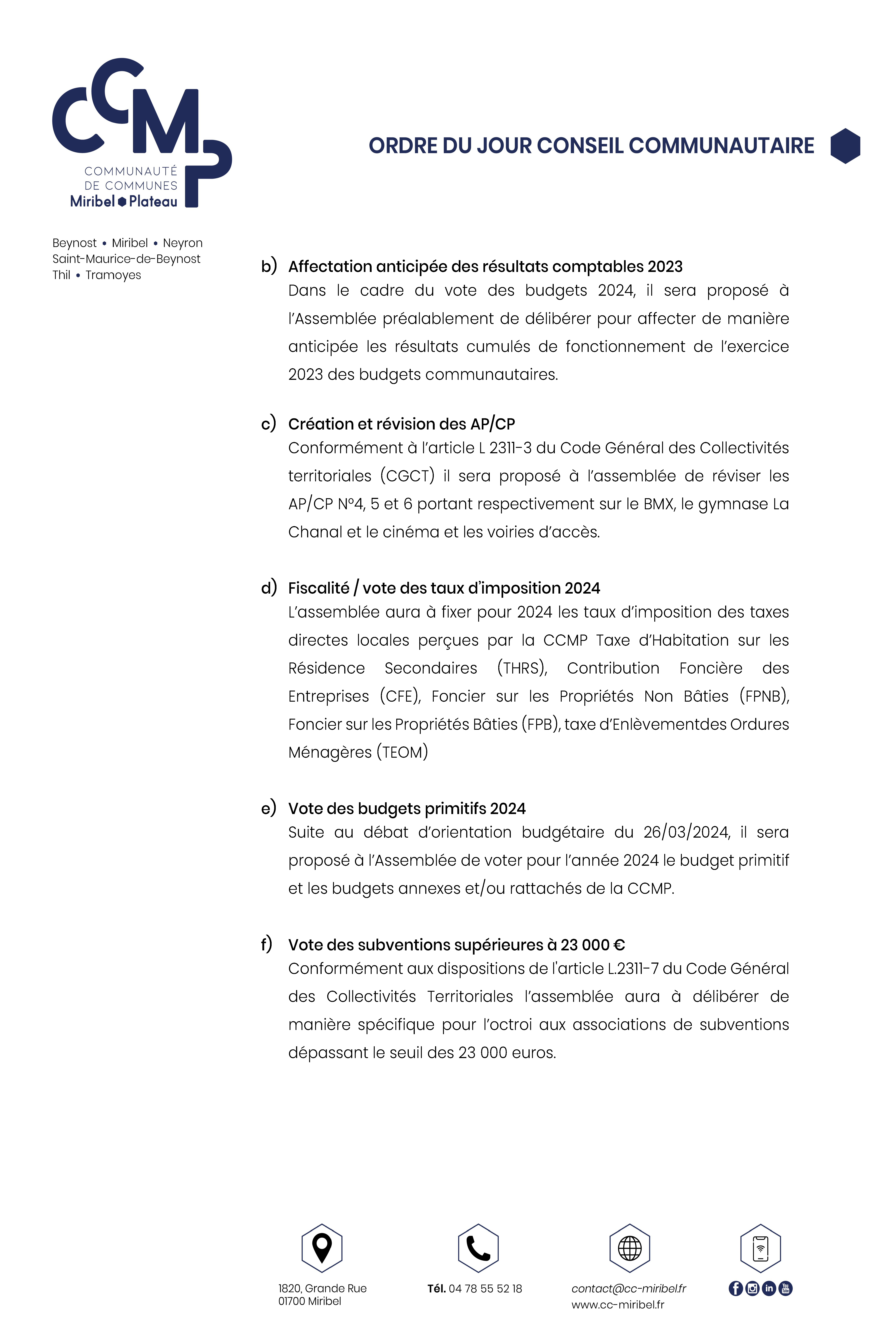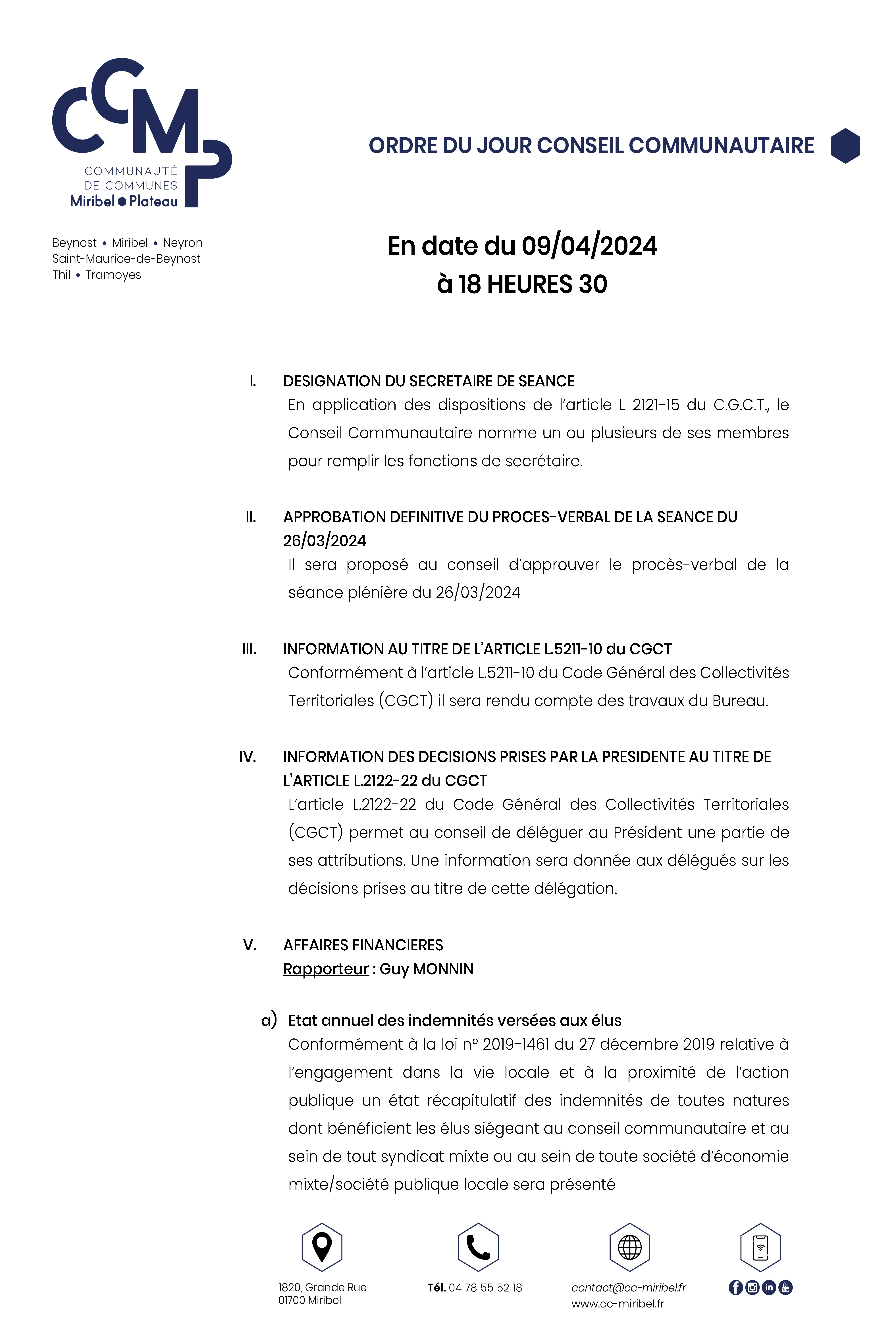 Le Conseil Communautaire de la CCMP se tiendra le mardi 9 avril 2024 à 18h30, au siège de la CCMP
