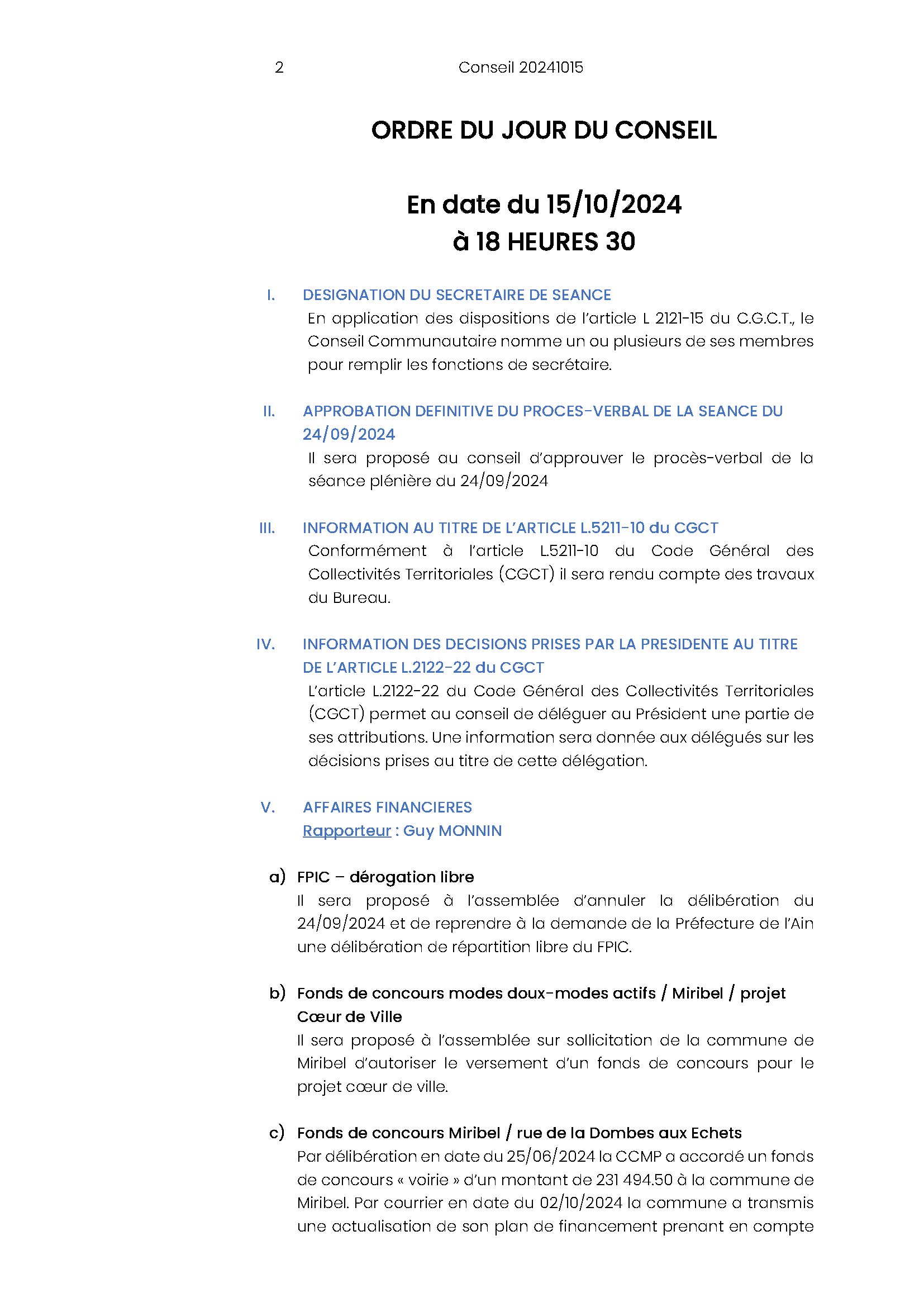 Ordre du jour du Conseil Communautaire :