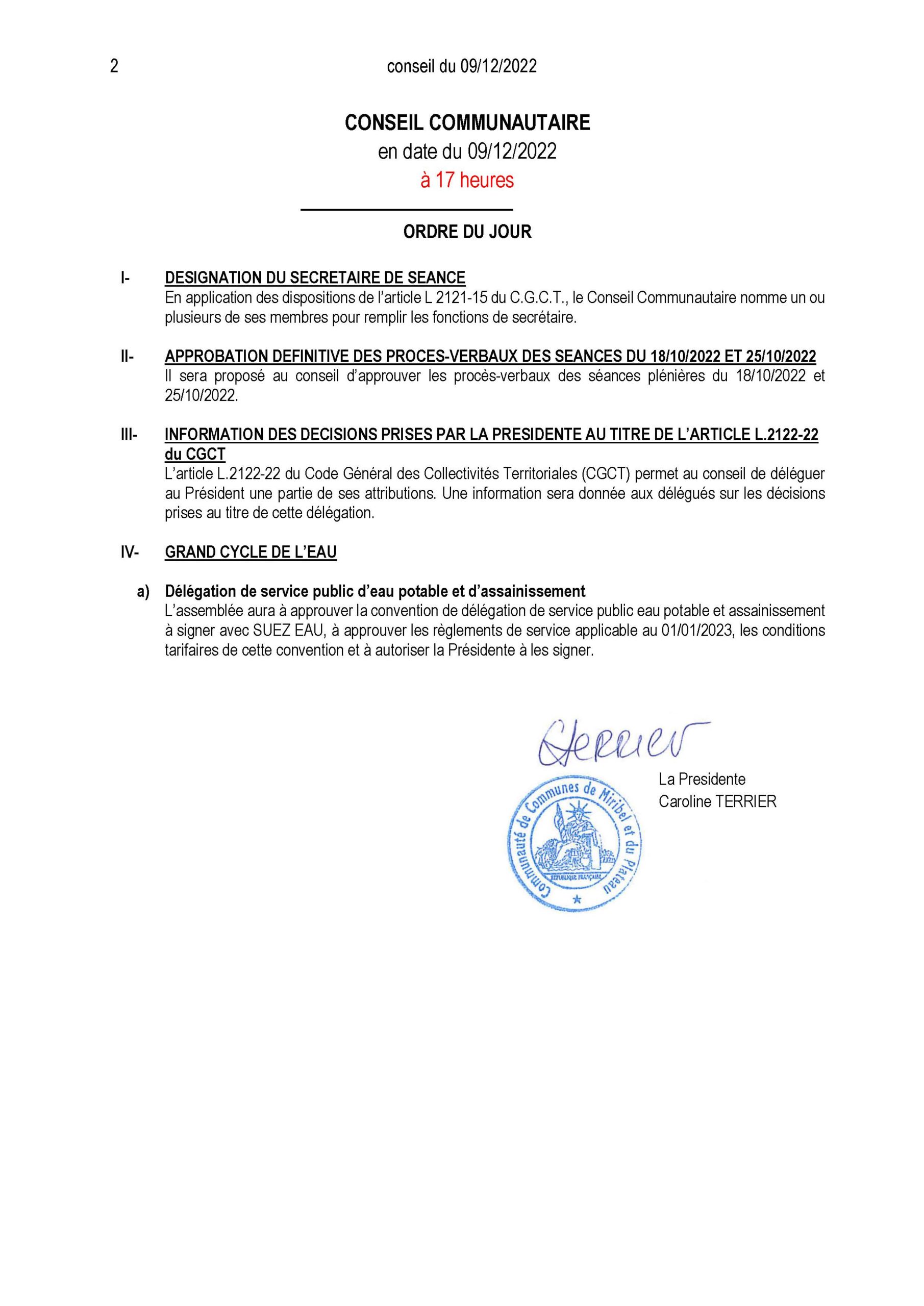 Ordre du jour du Conseil Communautaire :