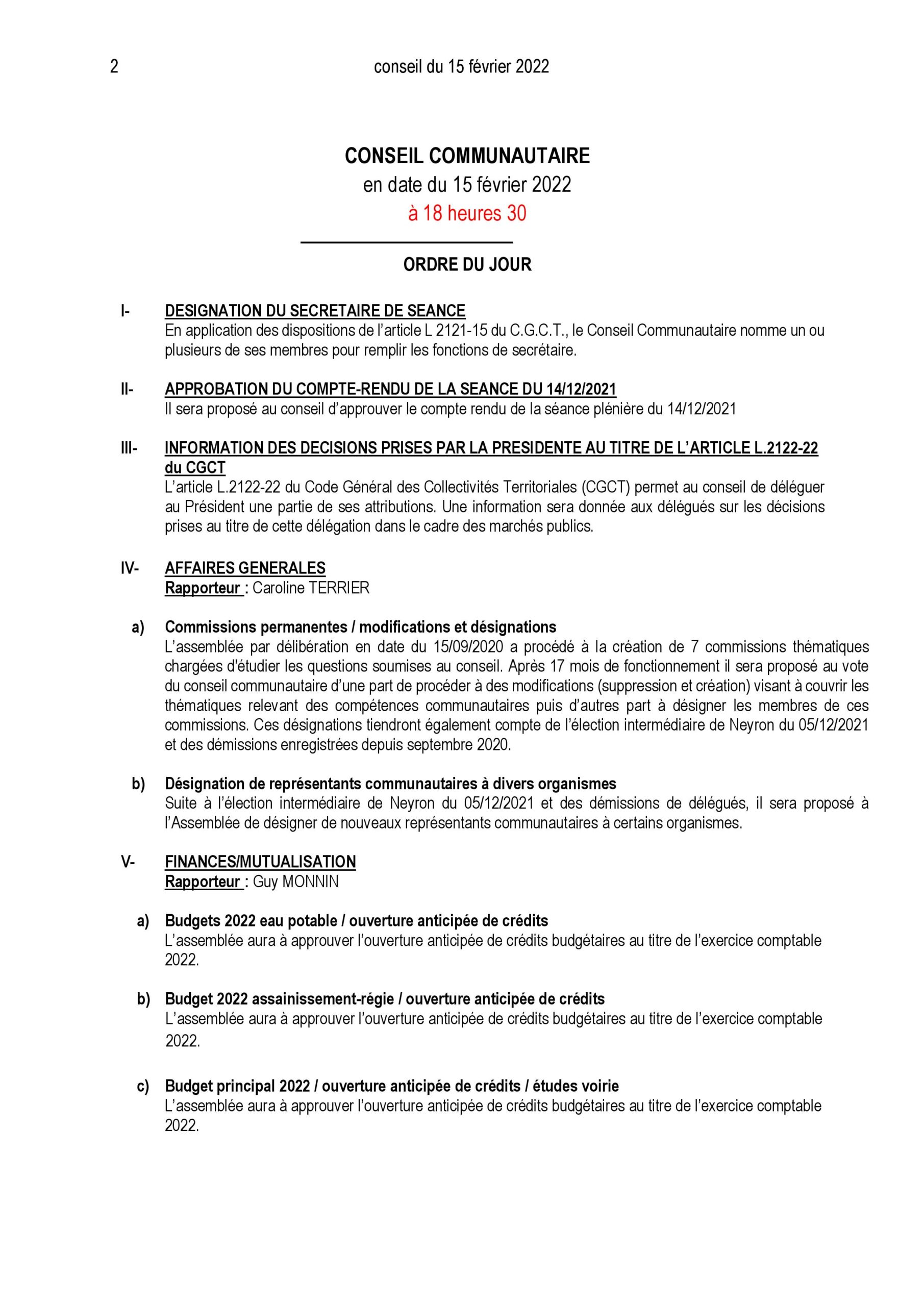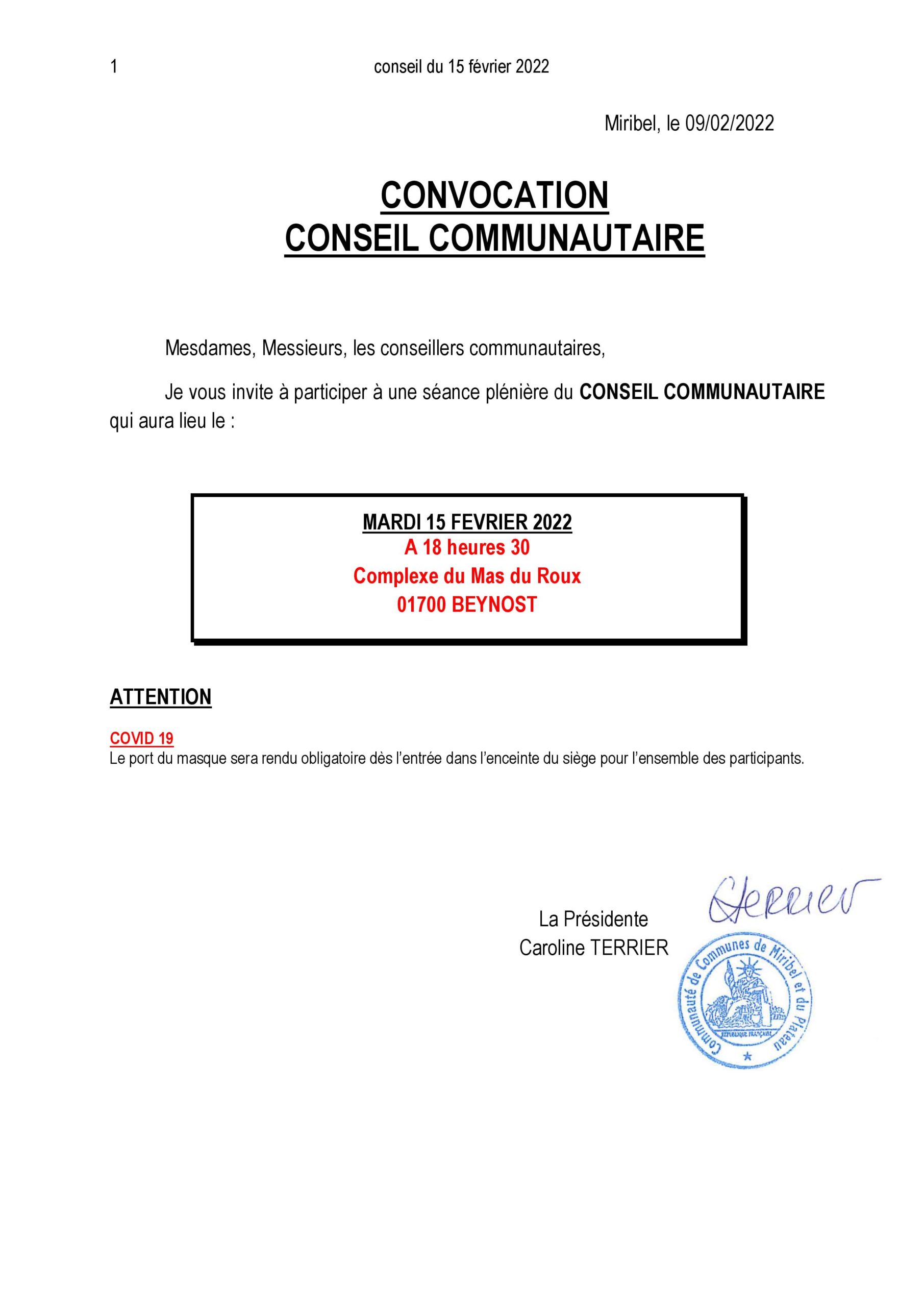 Convocation Conseil Communautaire le 15 février 2022