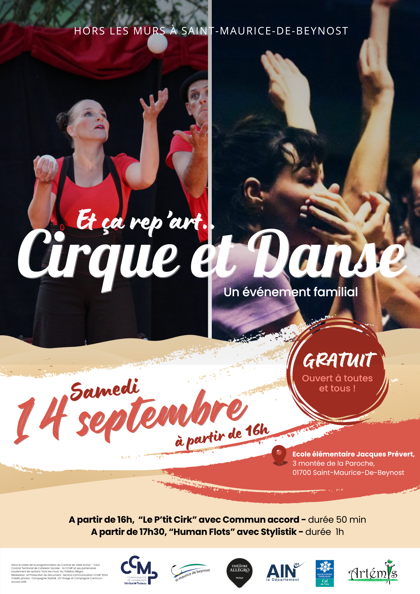 Dans le cadre de la programmation du Contrat de Veille Active – Futur Contrat Territorial de Cohésion Sociale, la CCMP soutient des actions hors les murs du Théâtre Allégro (TALL). En partenariat avec la CCMP et la commune de Saint-Maurice de Beynost, le TALL revient avec l’événement « Et ça rep’ART » Cirque et Danse. Une manifestation qui aura lieu le samedi 14 septembre 2024 à partir de 16h, devant l’école élémentaire Jacques Prévert, 3 montée de la Paroche à Saint-Maurice-de-Beynost.