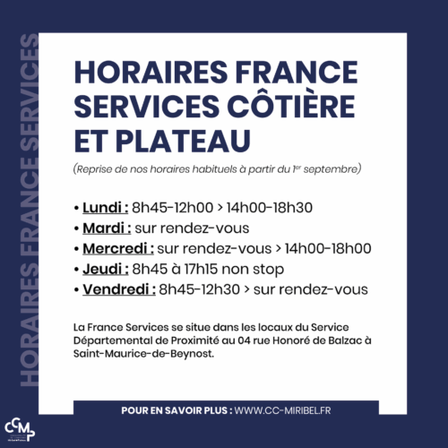 Contacter la France Services Les agents de votre France services vous accompagnent du lundi au vendredi aux horaires suivants : Lundi 8h45-12h00 14h00-18h30 Mardi sur…