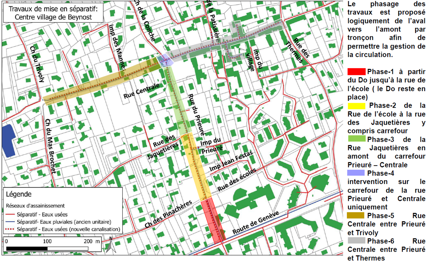 Il s’agit principalement d’assurer la séparation des réseaux d’eaux pluviales et d’eaux usées, jusqu’à présent mélangés. Au lieu d’être collectées ensemble et traitées sans distinction par la future station d’épuration, les eaux usées et les eaux de pluie seront collectées séparément : les premières seront traitées, mais les secondes seront soit infiltrées soit rejetées dans les milieux naturels.