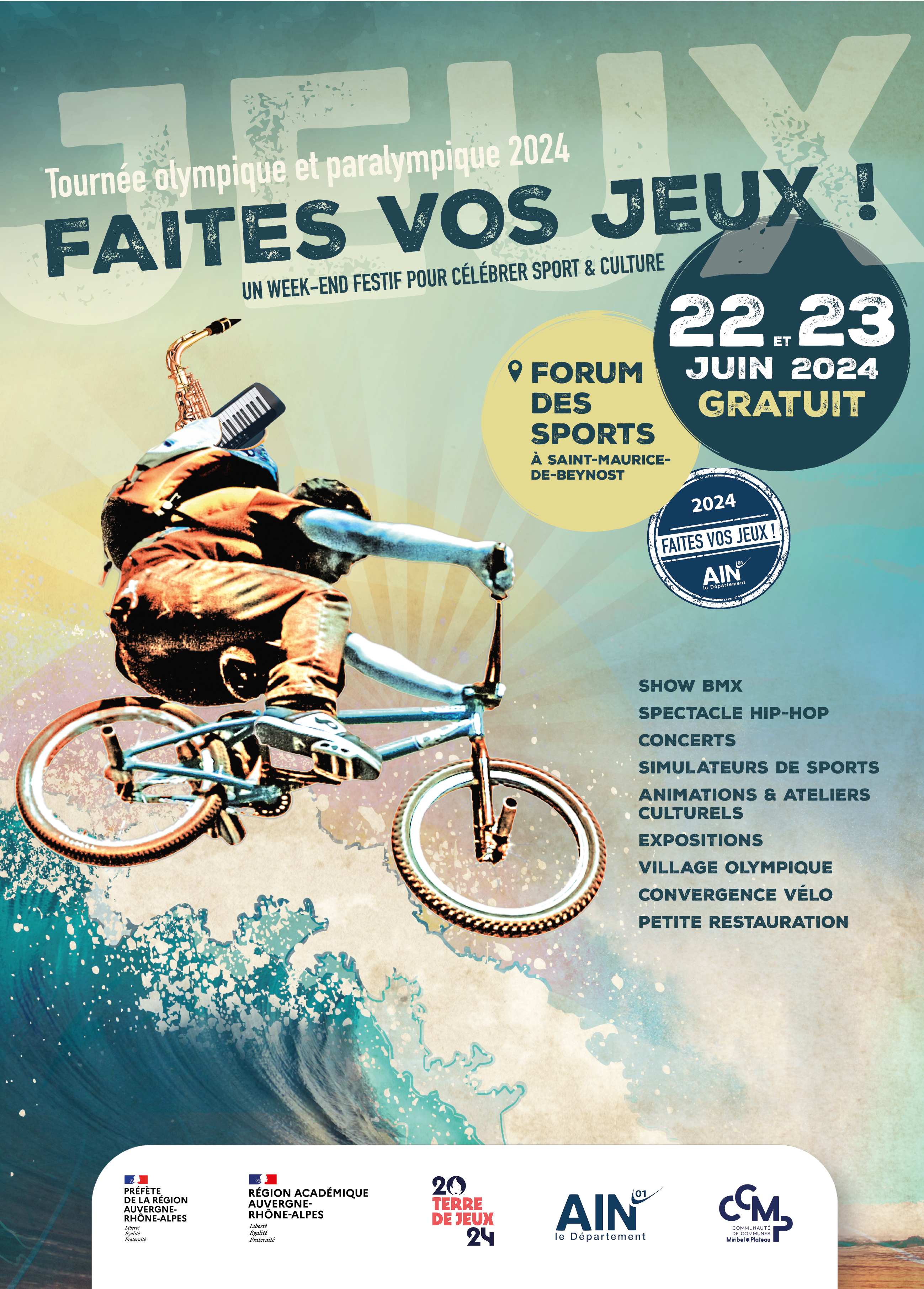 Samedi 22 et Dimanche 23 juin 2024, rendez-vous au Forum des Sports à Saint-Maurice-de-Beynost pour l'événement gratuit "Faites vos Jeux" dans le cadre de la tournée olympique et paralympique 2024, en partenariat avec le Département de l'Ain. Une programmation festive vous attend pour cette manifestation familiale autour du sport et de la culture ! Expérimentez de nouvelles sensations sportives, appréciez le calme d'une exposition, débattez et échangez autour du sport... Il y en aura pour tout le monde.
